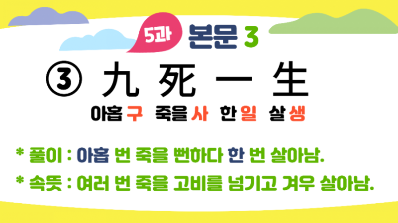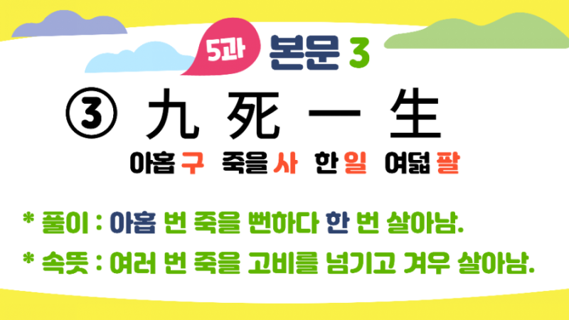학교 일정상 같은 단원을 어떤 반은 등교, 어떤 반은 원격수업하게 되었습니다. 등교수업 때는 학생들이 보기 편하게 칠판에 필기하지만 원격수업 시간에는 PPT가 편합니다. 시험 마지막 날 PPT 만들어 다음 날 원격수업 때 한참 설명하는데 ㅇㅇ이가 "선생님, 구사일생 밑에 여덟 팔 아니고 살 생 아닌가요?"