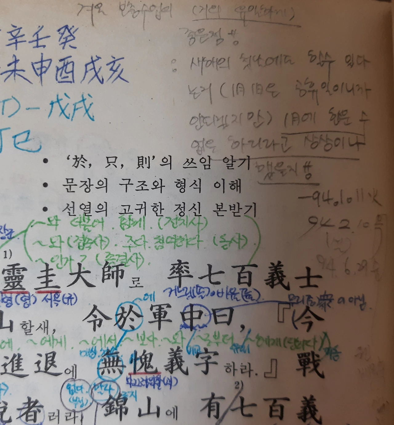 고1 겨울방학에 처음으로(어쩌면 3년 동안 유일하게) 한문 보충수업을 했습니다. 1월 3일 월요일 3교시 칠백의총, 1월 12일 수요일 2교시 형제투금, 1월 15일 토요일 4교시 차계기환. "겨울 보충수업의 (거의 유일하게) 좋은 점! : 새해의 첫 달에도 할 수 있다는 거. (1월 1일은 공휴일이니까 안 되겠지만) 1월에 한문 수업을 하리라고 상상이나 했을지!" 교과서 한켠에 쓴 말처럼 보충 세 시간은 한없이 설레고 가슴 뛰는 순간이었습니다.
