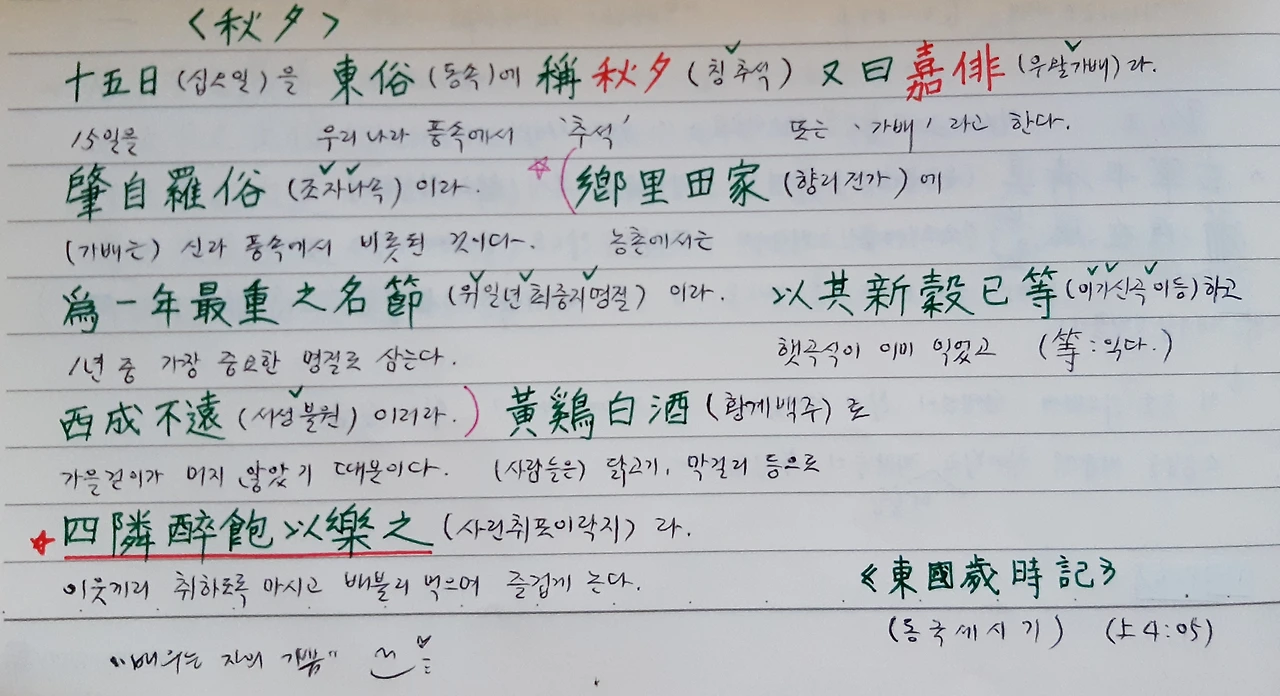 추석 연휴 전날 2학년 수업. 12과가 명절 단원이라 다른 때보다 '썰'이 길었습니다. 신라 유리왕 때 가배의 유래, 옛날에는 먹을 게 넉넉치 않아 설날과 추석처럼 큰 명절에만 고기 먹고 새옷 입을 수 있었단 이야기, 여자들은 친정 가기 어려워 명절 다음날 부모님과 집과 친정 중간지점에서 만나 '반보기'하던 일, 일요일과 법정공휴일이 없던 대신 농한기인 설날부터 정월대보름까지는 먹고 놀며 즐겼던 풍속들.
