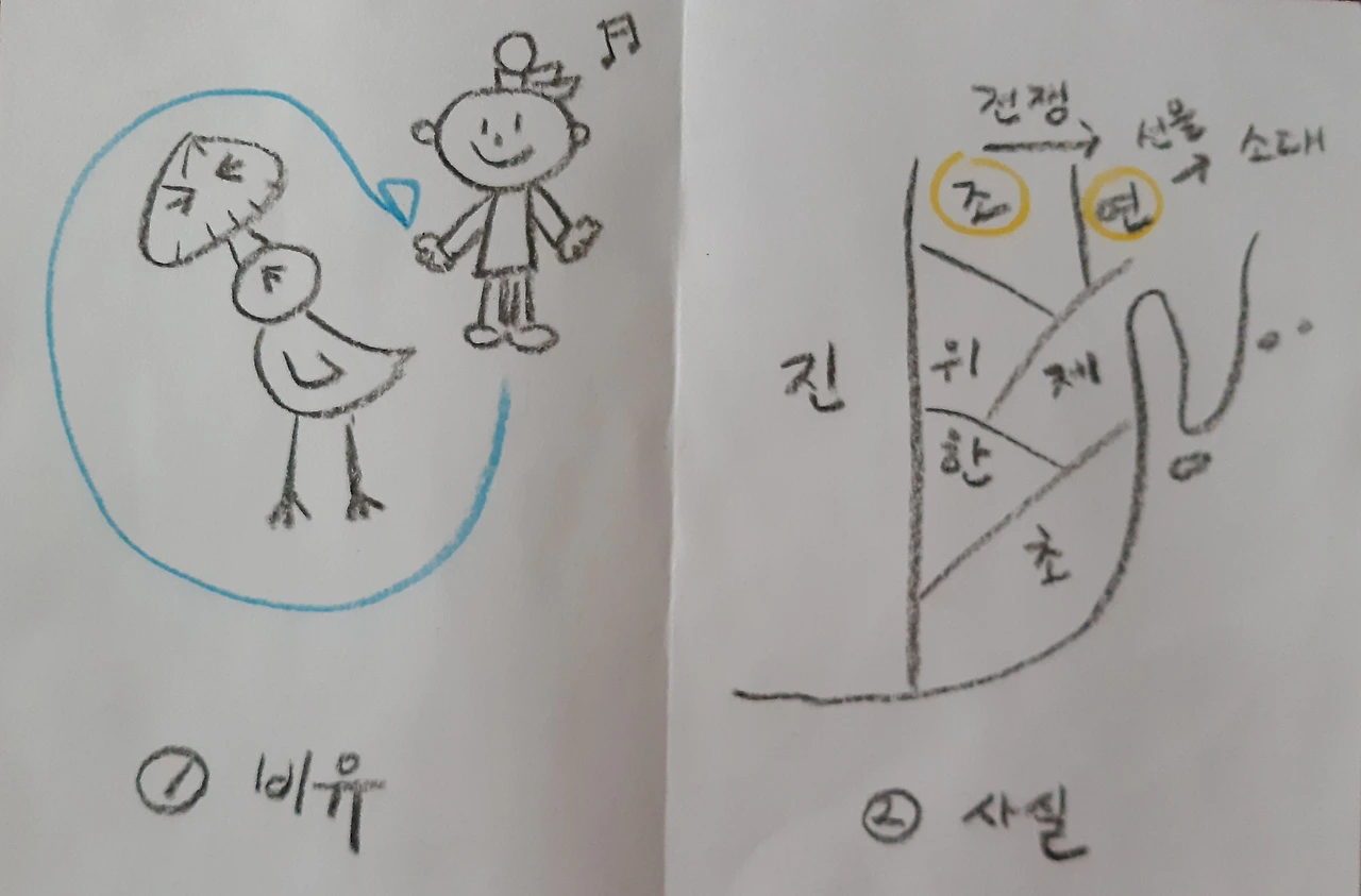 칠판을 반으로 나누어 전국시대 지도와 어부지리 그림 사이에 세로줄 긋고 "1번과 2번 사이에 어떤 것이 사실일까요?" "2번이요!" 조금 더 말하려니 마침종이 두두둥. 칠판에 그린 그림을 종이에 옮겨 사진 찍어서 그 다음 주 원격수업 시간에 복습할 때 잘 썼습니다. 비주얼 씽킹*까진 아니라도 아이들에게 작으나마 기억의 매체가 되었기를!
