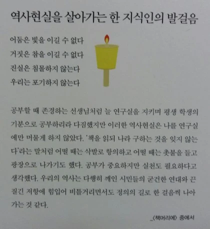 우리는 늦게나마 희생자 가족들과 함께 망각에 맞서는 고통의 연대를 이루어 이 참사를 우리 시대가 해결해야 할 현재진행의 사건으로 상기하고 상기시키는 일에 동참하고자 한다. 우리는 그것이 우리 사회에 조금이나마 지성과 양심의 빛을 비추는 것을 평생의 업으로 삼기로 한 지성인이자 제자들에게 이웃의 고통에 대한 공감의 소중함을 가르쳐야 할 스승으로서의 최소한의 의무라고 생각한다. 104쪽