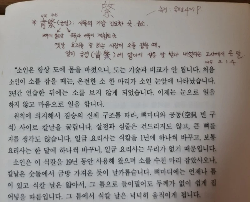 다음 해 이른 봄, 2학년 올라가기 직전 『재미있는 고전여행』을 샀습니다. 한참 읽고 자료 찾다 '긍경'에 '???' 옥편으로 찾아보니 '긍(肯)'은 뼈에 붙은 살이고 '경(綮)'은 근육과 근육이 결합된 곳입니다. 사물에서 가장 중요한 부분! 책에 하나하나 옮겨 쓰며 기뻤습니다.
