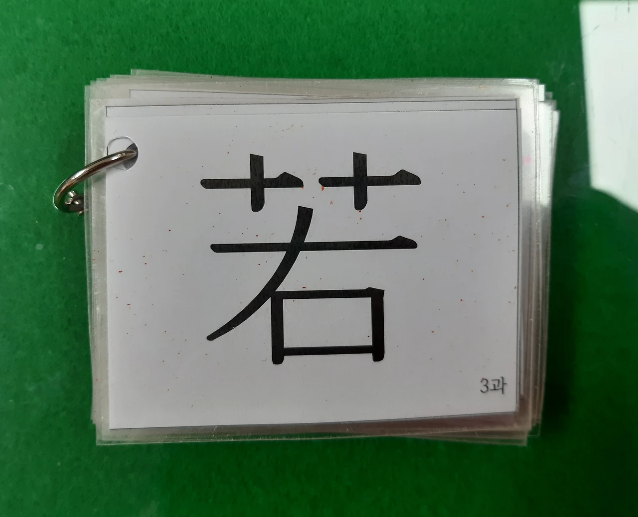 작년 기출문제로 모의고사 보고 ㄴ 카드를 봅니다. 하나하나 코팅해 고리 끼워 만든 카드. 앞면에는 한자, 뒷면에는 뜻과 음이 있습니다. 작은 글씨로 몇 과인지도 표시했습니다.