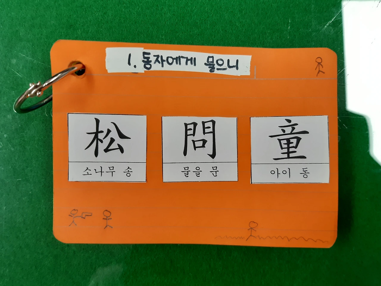 빛깔 있는 수첩에 단원명 쓰고 새로 나온 한자를 하나하나 붙였습니다.