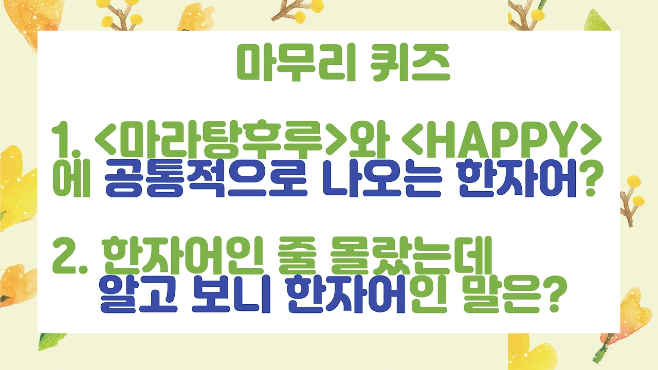 "정리합니다. <마라탕후루>와 <HAPPY>에 공통적으로 나오는 한자어가 있나요?"