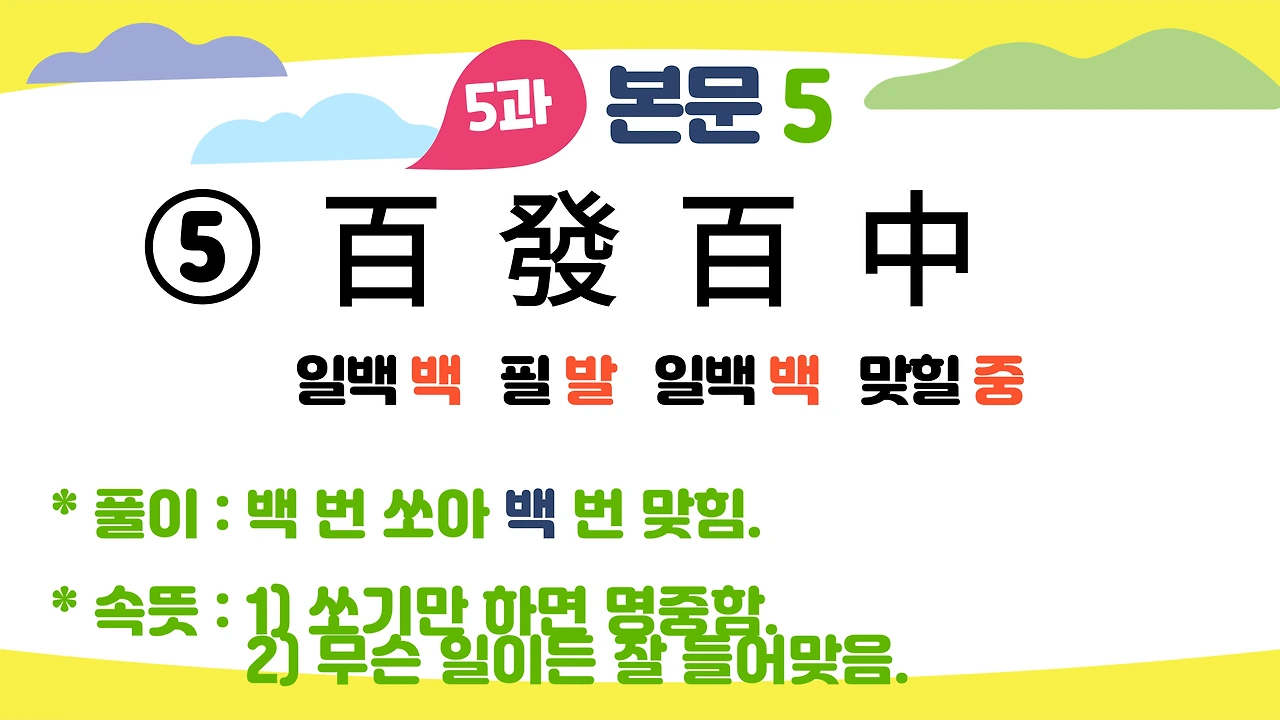 목요일 2교시. 1학년 5과 백발백중(百發百中) 설명하려니 ㄱ이 "선생님, 백발백중 노래 있어요!"