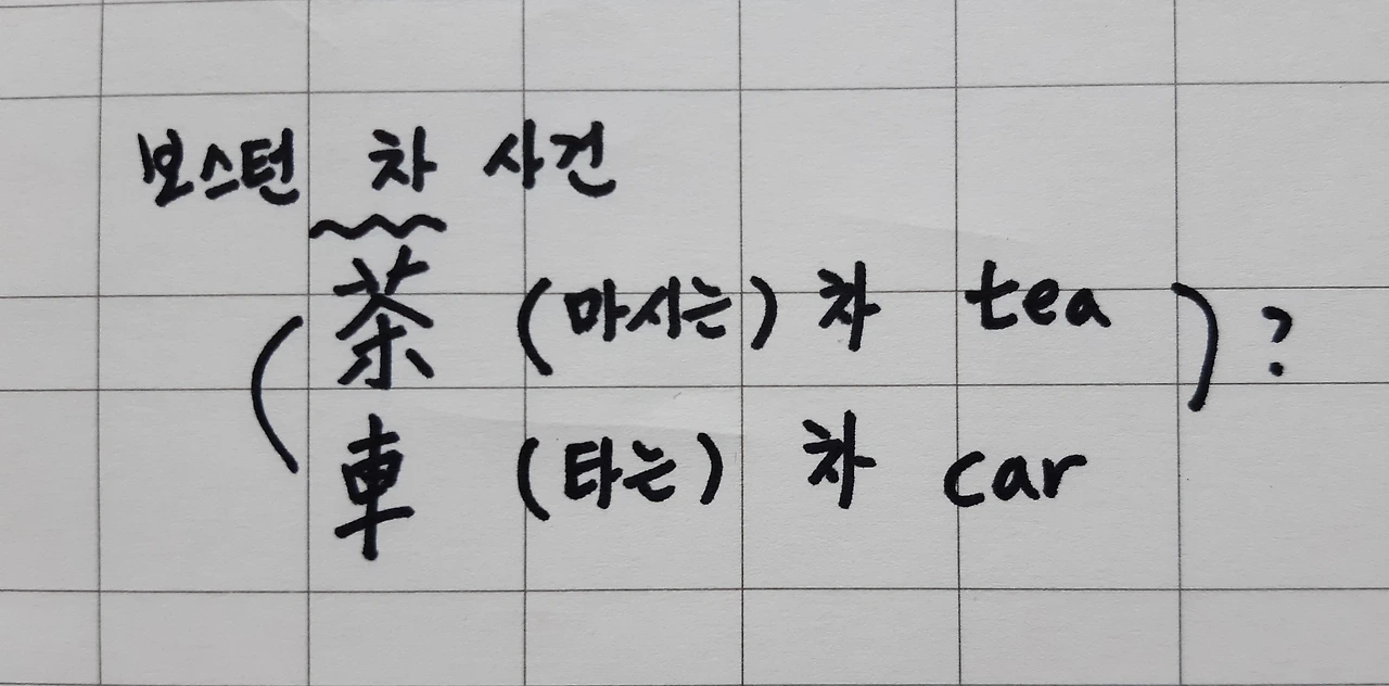 칠판에 '보스턴 차 사건', '茶', '(마시는) 차', 'tea', '車', '수레, 차', 'car' 쓰고 "보스턴 차 사건은 위의 것일까요, 밑의 것일까요?"