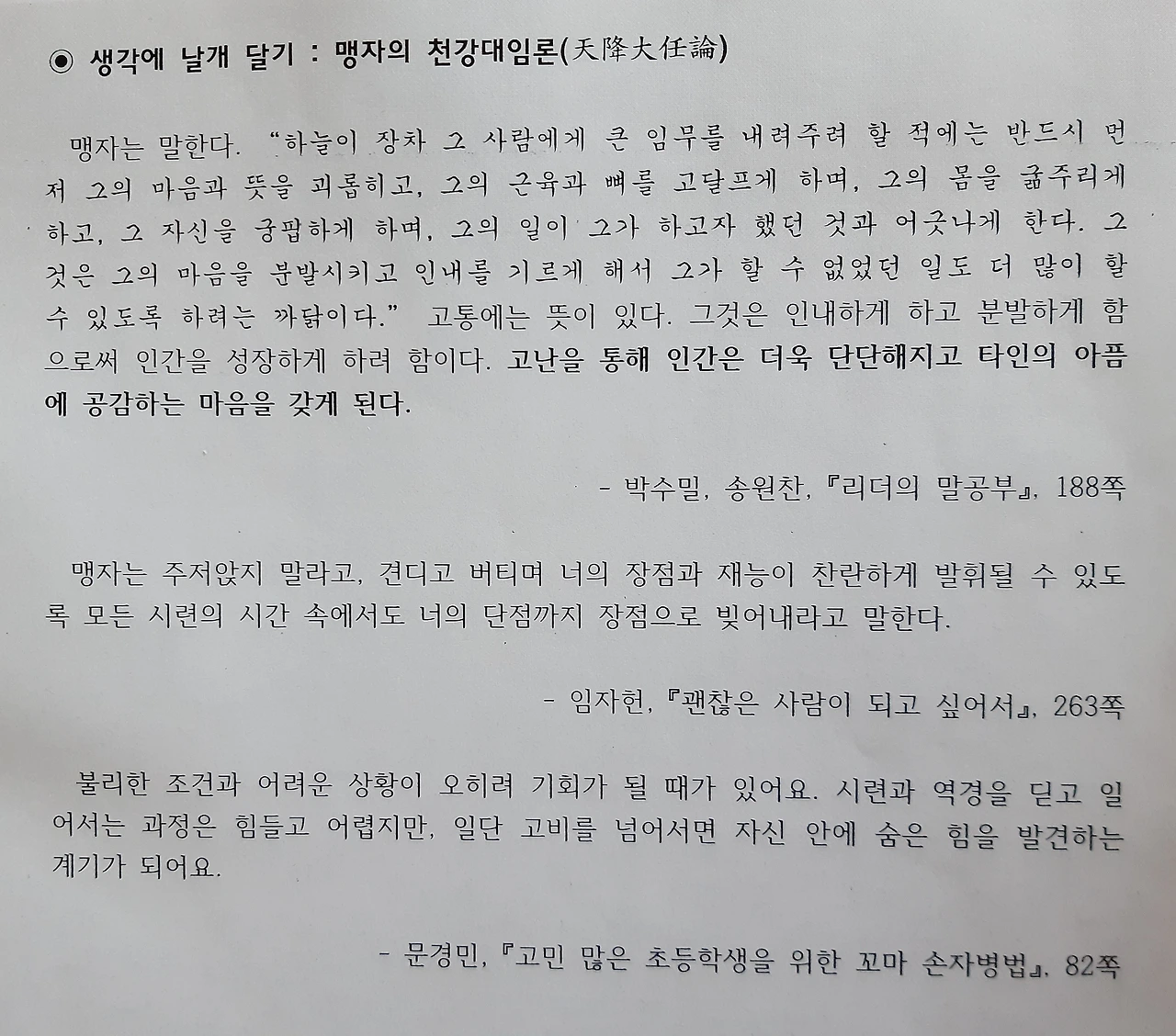 "맹자의 천강대임론은 2300년 전부터 지금까지 많은 사람들에게 힘과 용기를 주는 말입니다. 천강은 하늘 천, 내릴 강. 하늘이 내려 준다. 대임은 큰 대, 맡길 임. 큰 임무. 살다 보면 지각하면 혼나는 것처럼 내가 잘못해서 생기는 어려움도 있지만, 갑자기 아프거나 집에 일이 생기거나 친구 관계가 틀어지는 것처럼 내가 잘못하지 않았는데 생기는 어려움도 있어요. 천강대임론은 뜻밖의 어려움에 대처하는 방법을 일깨우는 말입니다."