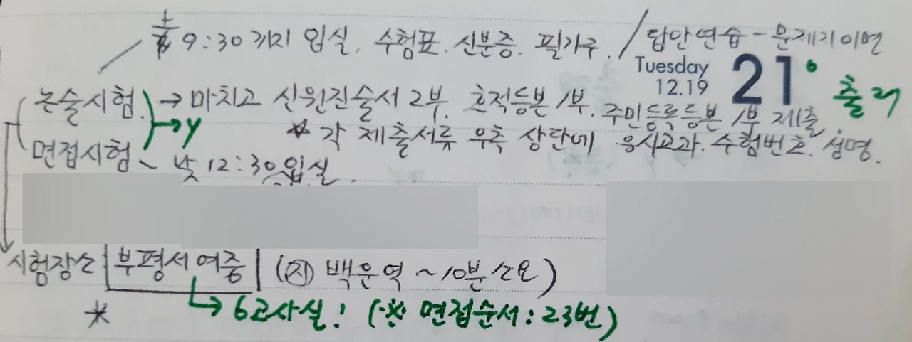 기차 타고 오는 내내 잠이 안 왔습니다. 새벽 3시 40분쯤 집에 와서 5시 10분까지 2차 시험과 하루 내내 있었던 일을 일기장에 옮겼습니다. 교육청 홈페이지뿐만 아니라 사무사*에도 여러 분들이 임용 1차 합격자 명단 올려 주던 시절, '230198' 수험번호 여섯 자가 더 묵직해 꼭 합격하고 싶었습니다.