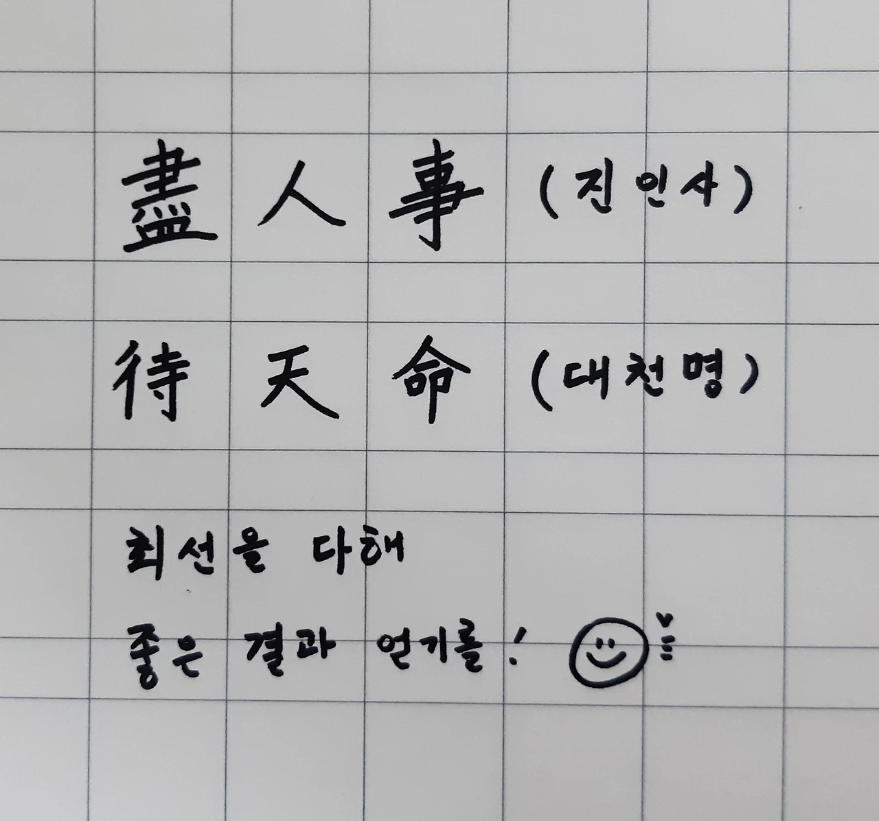 1차 정기시험 전날 "선생님, 저희 반 첫 시험인데 응원 말씀 부탁드려요." 칠판 보니 학급 회장의 "얘들아, 힘내자"와 담임선생님, 다른 교과 선생님 응원 말씀이 빼곡합니다. 왼쪽 아래 빈자리에 "盡人事(진인사) 待天命(대천명)"을 쓰고 "최선을 다해 좋은 결과 얻기를!"을 덧붙였습니다. 사인할 때 쓰는 웃는 얼굴과 하트도 그렸습니다. 몇몇이 "우와~" 수업 마치고 다른 아이가 복도에서 "선생님, 저 진인사 대천명 알아요."
