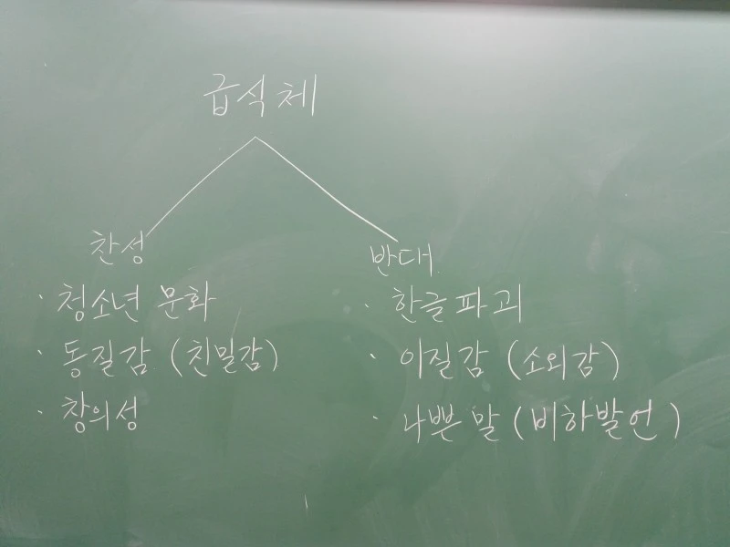 2019.11.12.(화)점수 나오는 날 학생들 의견을 칠판에 썼습니다. 대체로 찬성 반 반대 반. 찬성하는 아이들은 청소년 문화다, 같은 말 쓰면 동질감을 느낀다, 급식체가 창의적이라 세종대왕의 훈민정음 창조 정신을 계승하는 면이 있다. 반대쪽에선 한글 파괴다, 급식체 안 쓰는 청소년이나 잘 모르는 어른들이 소외감을 느낄 수 있다. '~충' 같은 비하 발언은 나쁘다고 생각한다.