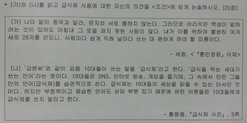 시험 당일. 연습용 원고지에 없던 훈민정음 서문 번역을 넣었습니다. 곳곳에서 한숨 푹푹. 그래도 답안 보니 기대 이상으로 잘 썼습니다. (가)의 일부를 반드시 인용해야 한다는 조건에 걸려 낮은 점수 받은 학생들이 여럿 있었지만, 뜻밖의 아이들이 번득이는 글 써 "우와!" 열여섯 살 청춘들의 또 다른 가능성을 보았달까요.