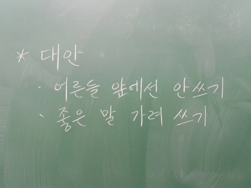 가장 수업태도 좋았던 4교시.찬성이든 반대든 나름 소신 있게 잘 써 줘서 고맙다고 했습니다. 여러 학생들이 대안으로 제시한 '어른들 앞에선 안 쓰기', '좋은 말 가려 쓰기'도 칠판에 옮겼습니다. 조금 엉뚱했지만 논술 준비하고 진행하면서 학생들과 더 깊고 넓게 이야기할 수 있어 좋았습니다. 눈 맑은 아이들이 세종대왕의 옛글과 애민정신을 지금 눈높이로 이해하는 데 작으나마 도움이 되었기를.