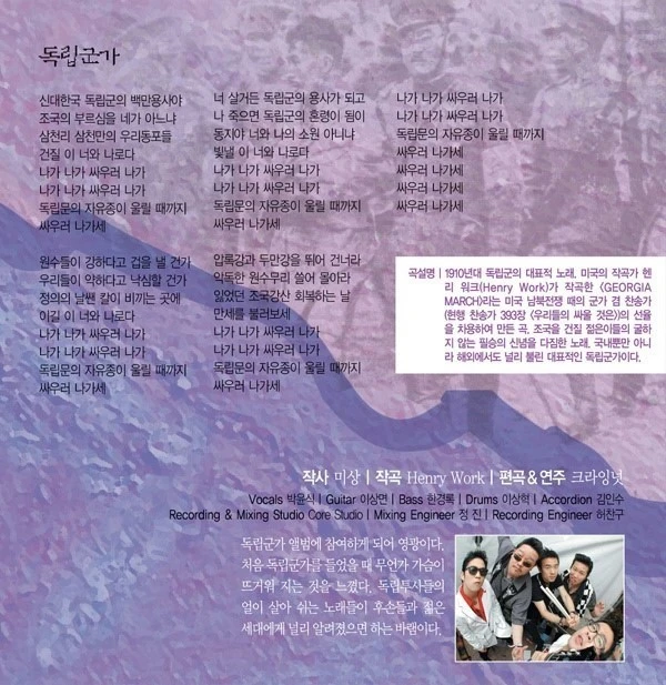 "2005년 '광복 60년 독립군가 다시 부르기' 음반이 나온 적이 있다. 신세대 취향에 맞춰 대중가수와 록 밴드가 재해석한 독립군가들과 국군 군악대 버전이 함께 실린 독특한 두 장짜리 음반이다."(김건수, 부산일보 2018.10.4) 늦은 밤 노래 듣다 제대로 뭉클했습니다. <독립군가>와 <미스터 션샤인>, 은근히 닮았습니다. '재해석' 세 글자에 이렇게 설레다니! 마지막 회 의병 사진처럼 그때 그 사람들이 걷는 듯, 보이는 듯합니다.