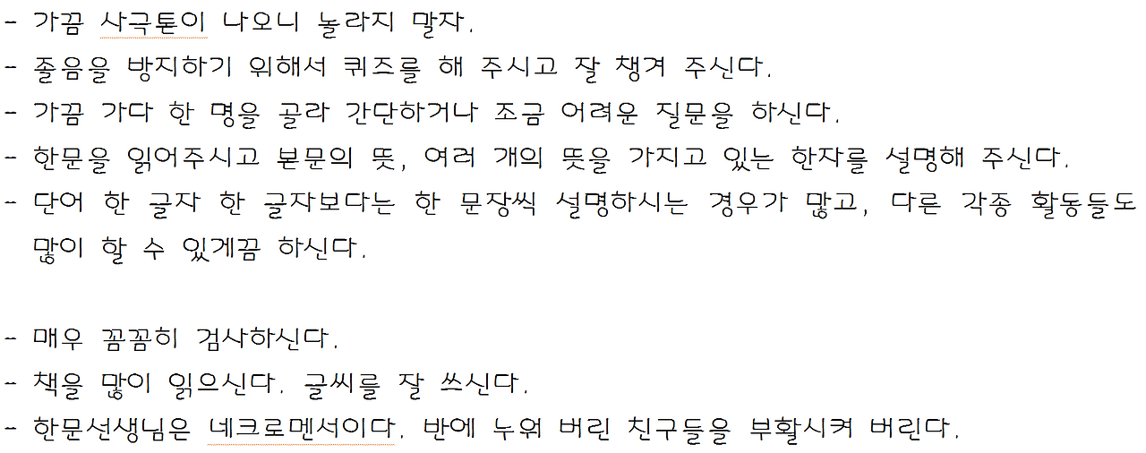 "한문 시간에 엎드려 있거나 자게 되면 선생님께서 "머리를 드시오~"라고 말씀하실 거다. 선생님이 다가오실 때 조금 무서우니 수업시간에 자지 말자." 여러 학생이 비슷한 말 써 주어 '유심히 봤구나' 했습니다. 고마운 말 많지만 이 글을 가장 오래 읽었습니다. "한문 선생님은 네크로멘서이다. 반에 누워 버린 친구들을 부활시켜 버린다."