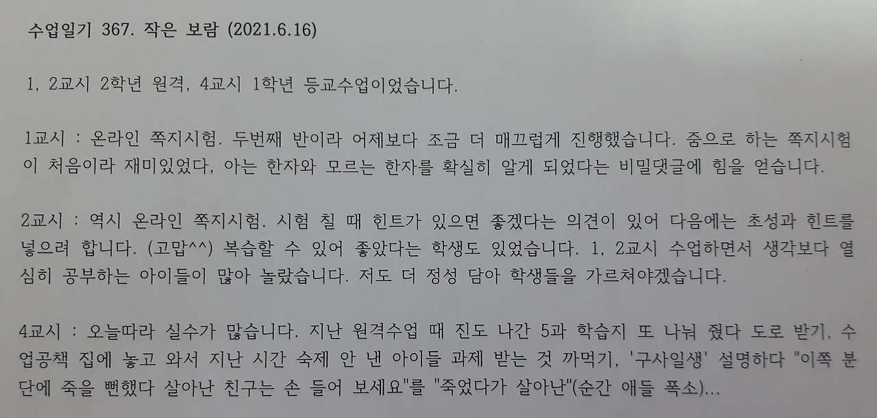 기쁜 날은 길게 쓰고 아린 일은 간결하게 담아내니 따스한 기억이 더 오래 남습니다. 창의한자 예시 들다 웃음 폭탄 터진 순간, 구사일생 수업하다 "죽을 뻔했다 살아난 친구는 손 들어 보세요"를 "죽었다가 살아난"(순간 애들 폭소), 같은 단원인데 어떤 반은 토크쇼, 다른 반은 시트콤, 또 다른 반은 휴먼다큐였던 시간들!