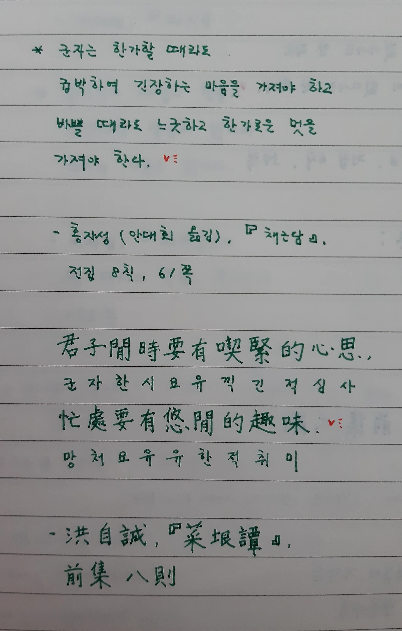 * 홍자성(안대회 옮김, 민음사, 2022.)의 『채근담』 전집 8칙 61쪽에서 인용했습니다. 원문은 "君子閒時要有喫緊的心思(군자한시요유끽긴적심사),