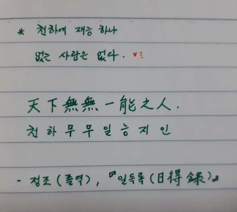 "天下無無一能之人(천하무무일능지인)이니. 천하에 재능 하나 없는 사람은 없으니. 若聚十百人而(약취십백인이). 만약 사람 열 명 백 명을 모아. 우리 반 담임선생님까지 몇 명이죠?"