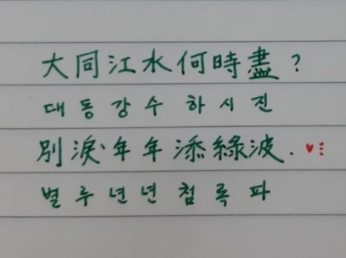 "대동강 물은 어느 때나 마를까? 갑자기 대동강 물이 왜 나올까요. 이별 눈물 해마다 푸른 물에 더해지니. 마지막 구절 때문에 이 시가 유명해요. 그대를 그리워하는 내 눈물이 푸른 대동강 물에 더해지니 대동강 물은 마르지 않을 거다. 그만큼 내 슬픔이 크고 깊단 말이겠습니다. 마지막 구절을 세 번 반복해서 "우헐장제초색다한데 송군남포동비가라. 대동강수하시진고? 별루년년첨록파라. 별루년년첨록파라. 별루년년첨록파라." 이렇게 읊기도 한답니다."