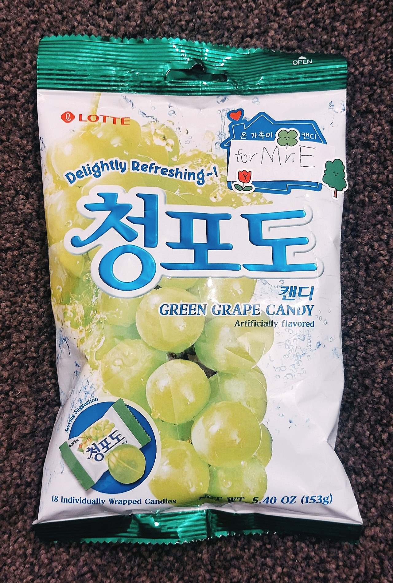지난주에 한국마트에 갔더니 청포도 사탕이 있길래 친구들 좀 나눠주라고 사서 보냈는데 이것도 또 애들이 난리가 났었다네요. 제이콥은 제발 하나만 더 달라고 무릎을 꿇고 애원을 했다나.. 이랬던 전적이 있으니 선생님이 사탕을 오픈한 순간, 반 애들이 얼마나 기대했을지 짐작이 가고도 남는다.
