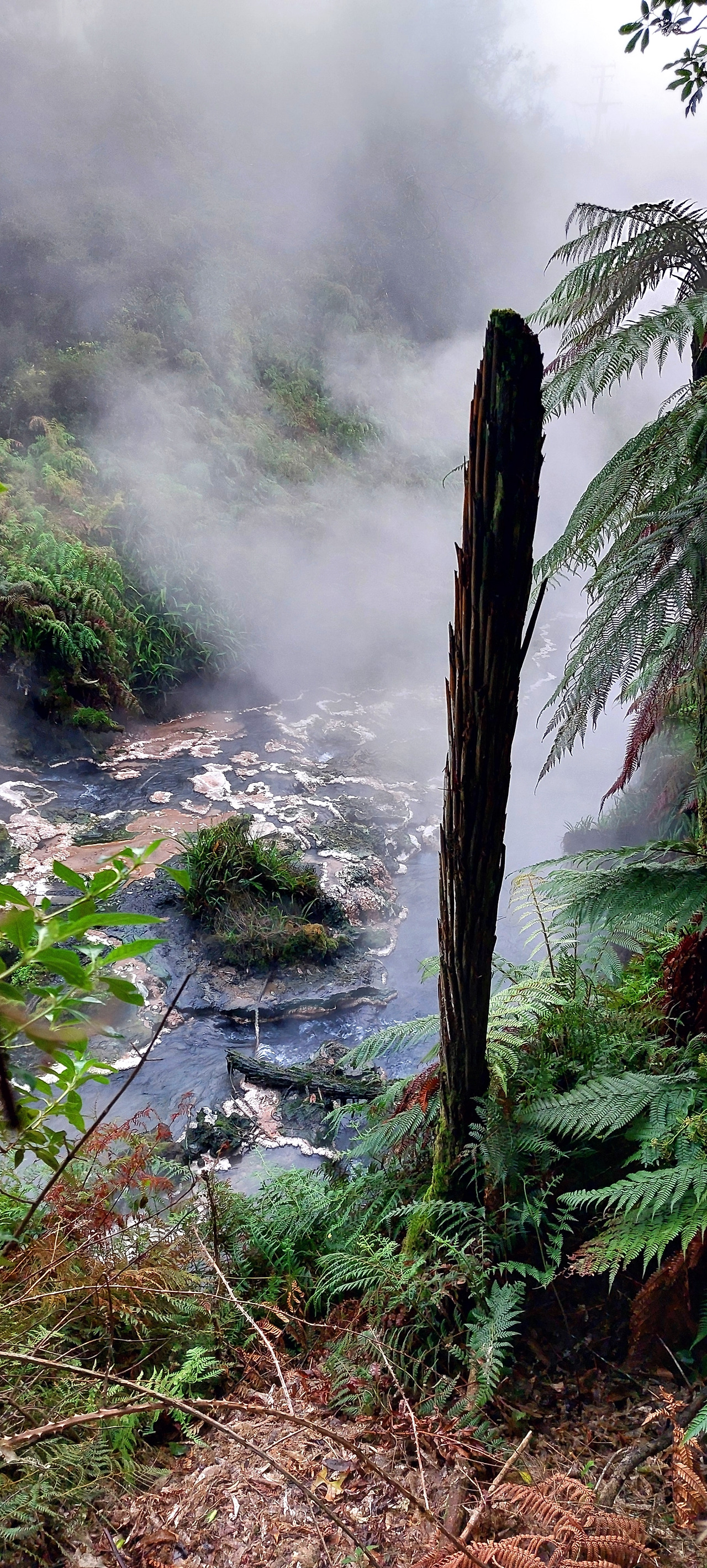 지옥천에서 솟구친 99도의 물이 계곡을 따라 흐르며 두꺼운 수증기를 내뿜었다. 뜨거운 물에서 펄펄 나오는 김이 시야를 가리는데, 가끔 바람의 방향이 뿌연 수증기를 치우면, 작은 계곡 사이에 빼곡히 채워있는 열대우림에서 볼 법한 초록초록한 식물들의 자태가 드러났다.