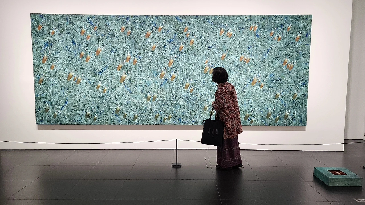 "새벽 햇살이 비췰 때 벼 위에 맺힌 이슬을 본 적 있어요? 그 물방울이 꼭 이렇게 생겼어요. 40년 전에 그의 그림을 선물 받았어요. 떠날 날이 다가올수록 그림에 가득한 물방울을 보며 갈 길은 바쁜데 할 일이 많아 마음 분주하게 저렇게 쏟아냈구나 싶어 볼 때마다 눈물이 나요."