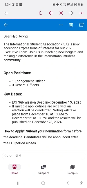 그렇게 승낙 회신을 보냈고, 한 달 가량에 걸쳐 심사가 진행되었고 위너부터 차례로 3등까지 순서를 정했으며, 시상식은 멜버른에서 있었기에 참석은 할 수 없었지만 정말 좋은 경험이 되었다. 게다가 국제 학생회에서 학생회 임원으로 선거에 출마해 달라는 요청을 학생 회장으로부터 직접 받았고 2025년 임원 선거에 출마하기도 했다. 한국 학생은 한 명도 없고 선거 활동도 하는 것이 아닌 데다 인도 학생들이 주를 이루는 학교여서, 인도 친구들이 선출되었지만 한국인으로서 임원 선거에 도전했다는 것에 의의를 두었다.