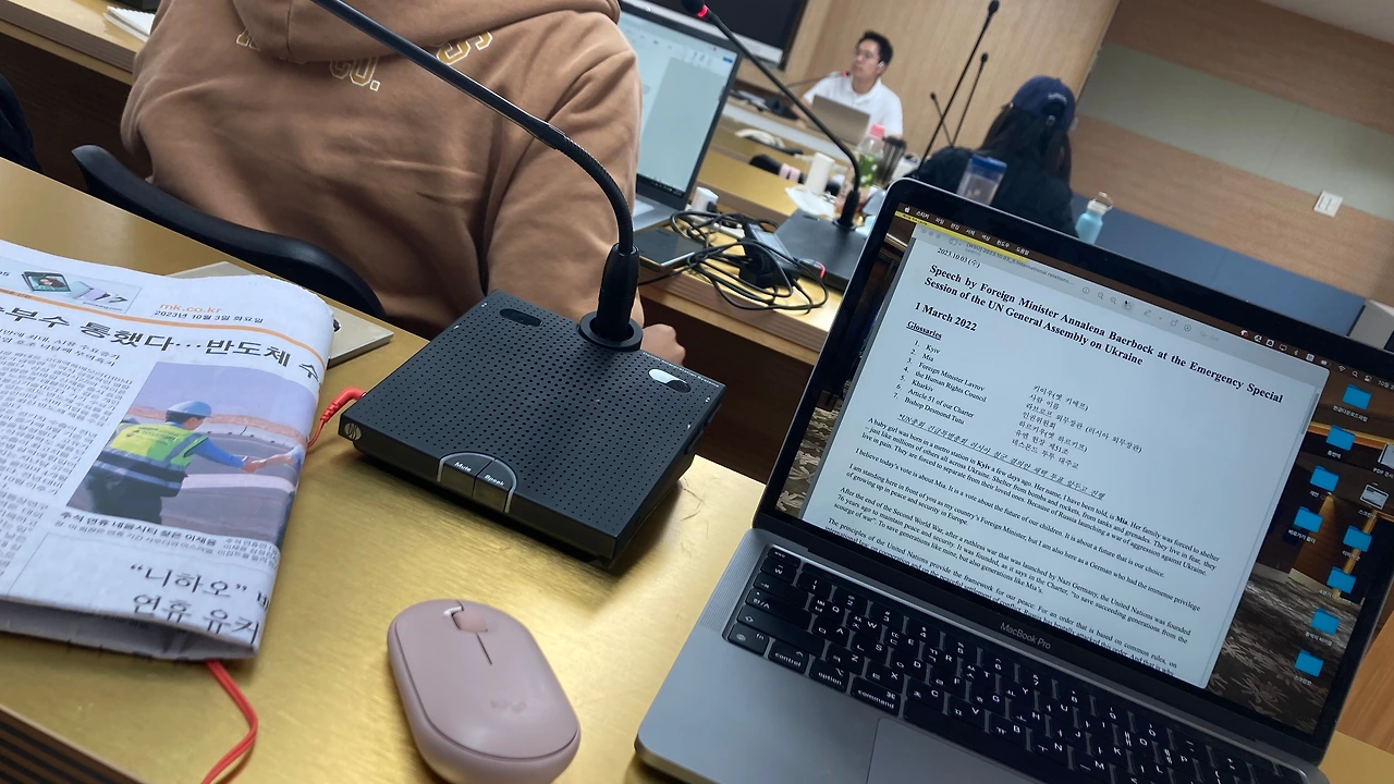 동시통역 수업 시간에 몰래 찍 >, < - 동시 너무 잘하시고 목소리도 좋으신 조 00 교수님