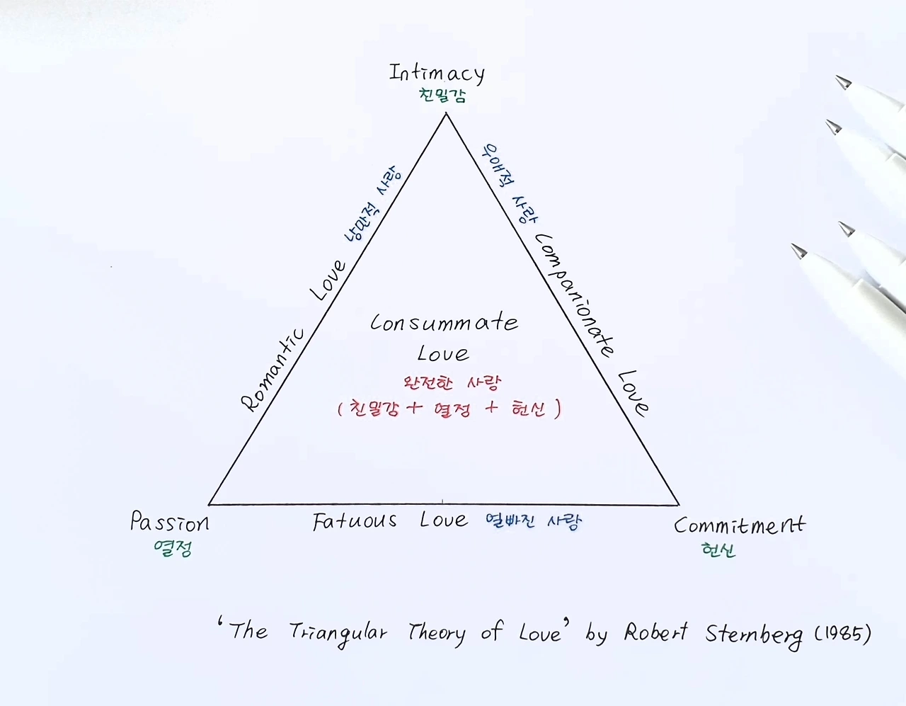 이제 사랑하고 있는 사람을 한 명 떠올려 볼까요? 미국의 저명한 심리학자 R. Sternberg의 'The Triangular theory of love(사랑의 삼감형 이론)'을 인용해 우리가 어떤 사랑의 상태에 도달해 있는지 보겠습니다.