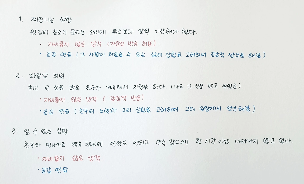 이 연습의 핵심은 처음에 일어나는 자동적인 반응을 그대로 허용하는 것입니다. 물론 처음부터 바로 타인의 입장부터 고려하여 자비로운 결론을 내는 분들도 계실 겁니다. 하지만 저는 처음에, '아니 도대체 아랫집 생각은 전혀 안 하는 사람인가? 어떻게 새벽부터 저리 시끄럽게 청소기를 돌려서 사람을 깨우지?', '나도 그 상을 받기 위해 노력했다는 걸 아는 애가 저렇게 내 앞에서 자랑을 늘어놓다니... 정말 배려심이 없다', '무슨 일이 생긴 거면 기다리는 사람 생각해서 미리 연락을 해 줘야지, 참 너무하네'와 같은 생각이 먼저 들 것 같아요. 그리고는 큰 숨을 한 번 들이쉬고 다시 생각해 보려고 노력할 겁니다. '아, 참, 아침 일찍 가게 나갔다가 밤늦게 들어오는 사람들이지... 그럼 집 청소할 시간이 지금밖에 없을지도 모르겠다', '저 친구만큼 노력한 나야말로 이 상이 어떤 의미인지 잘 알지. 열심히 노력해서 받은 상이니 얼마나 기쁘겠어', '연락조차 할 수 없는 상황이 생긴 거면 지금쯤 얼마나 나에게 미안해하며 전전긍긍하고 있을까? 혹시 무슨 큰 일이라도 생긴 거면 어쩌지?라고요.