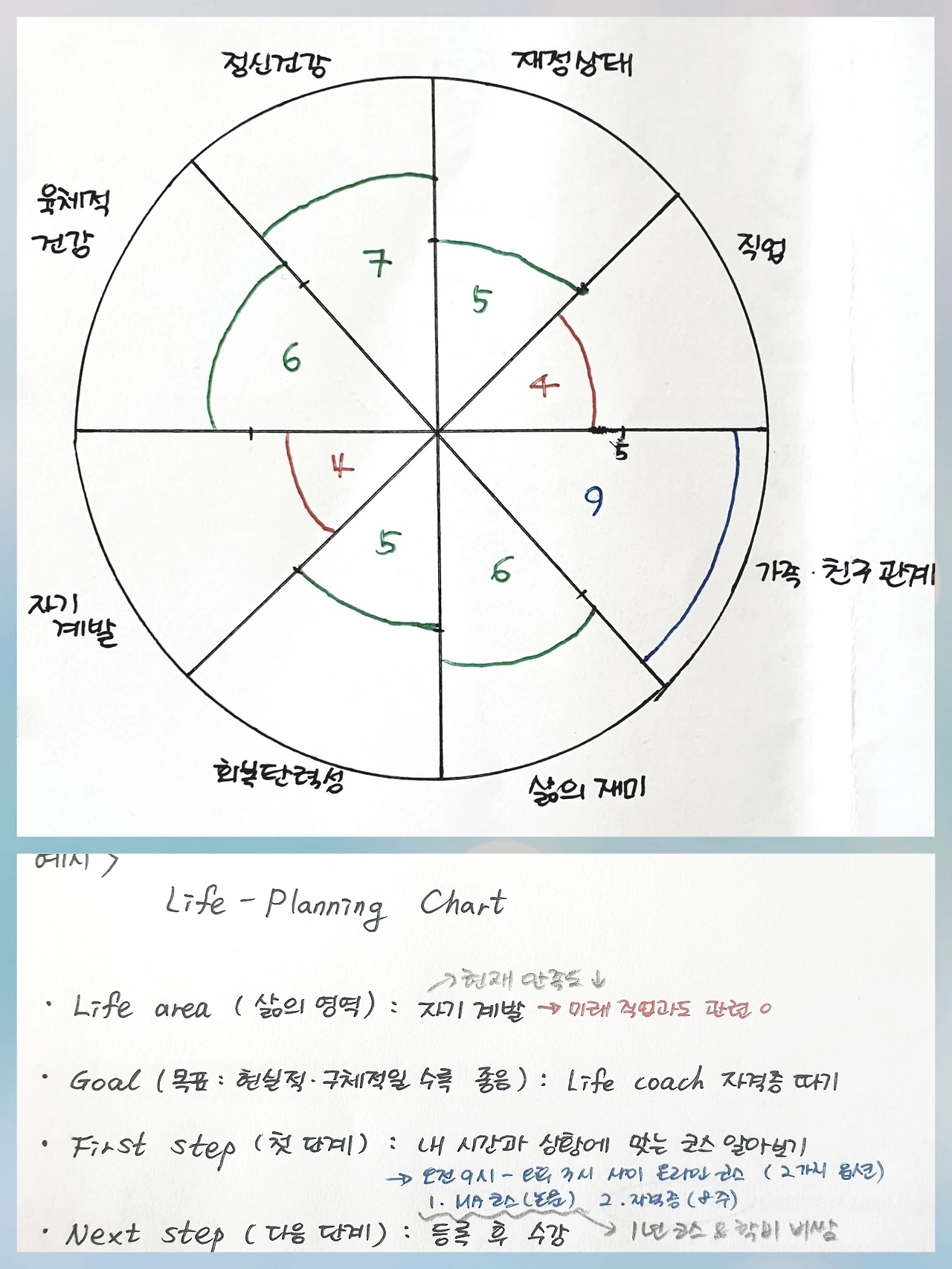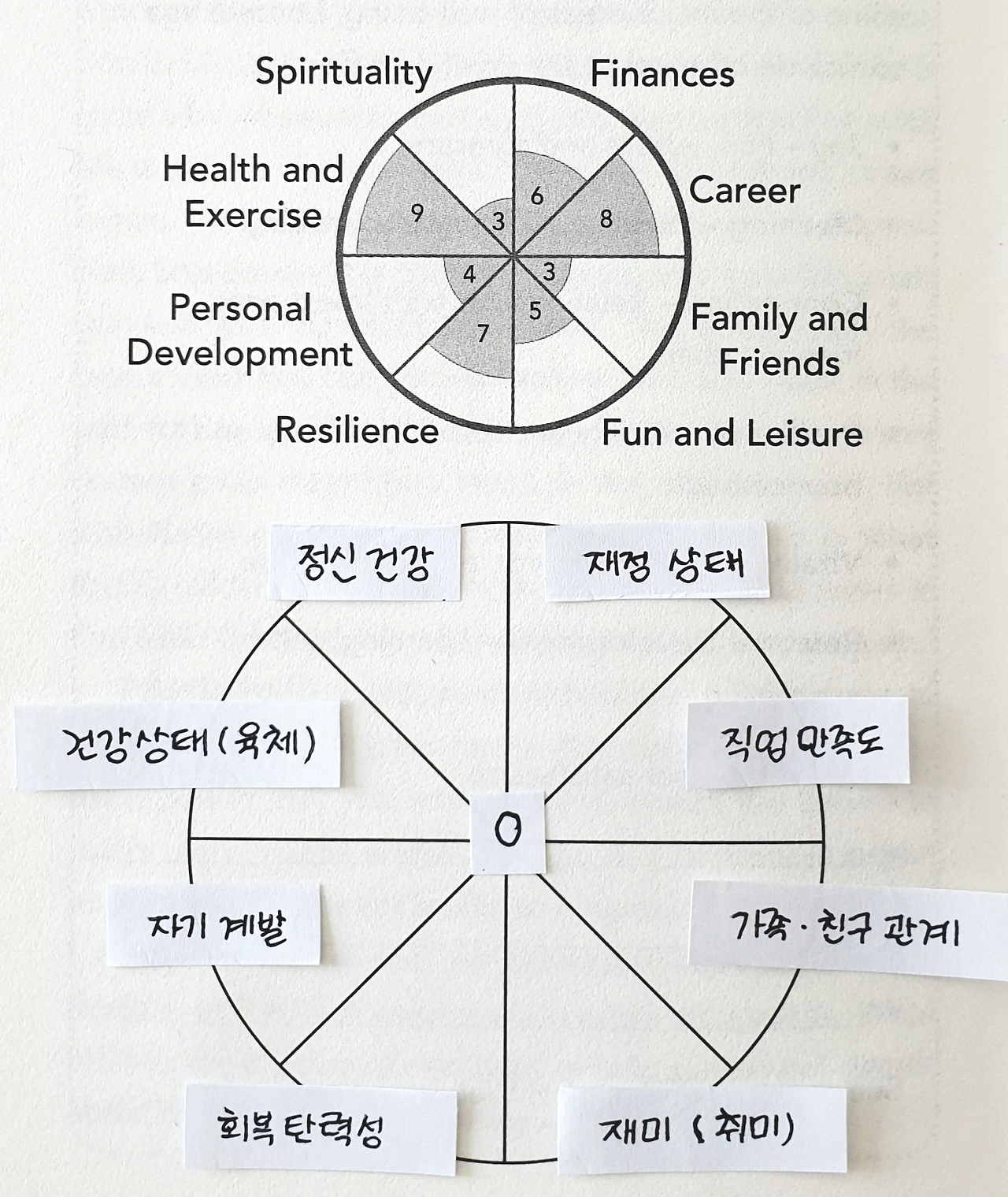 이 모형을 해 보는 이유는 우리의 '현재'를 알기 위함입니다. 우리가 어떤 상태로 살아가고 있는지 지금의 모습을 객관화시켜 돌아봐야 앞으로 더 나은 삶을 위해 필요한 게 무엇인지 알 수 있습니다. 균형 있는 삶을 위해 더 노력해야 할 영역은 어디인지, 혹은 다른 영역에 비해 더 중요하다고 여기는 영역은 어디인지, 또 어느 영역에서 우리가 지금 잘해 내고 있는지 등등 모형을 통해 자신의 삶을 크게 조망해 볼 수 있는 기회를 가질 수 있습니다. 각 영역의 만족도를 0점에서 10점까지 주시면 되고 중심 0에서 멀어질수록 점수가 높아집니다. 두 가지 항목에 관한 설명을 덧붙이자면, Spirituality는 우리 인생에 어떤 의미 있는 활동들이 있는지 돌이켜보고, 명상이나 정적인 활동을 통해 마음의 고요를 경험하고 있는지 생각해 보시면 됩니다. Resilience는 회복탄력성인데요, 실패를 대하는 우리의 자세를 곰곰이 돌아보시고 자신이 인생의 난관들을 헤쳐나갈 때 상심 후 얼마나 건강하게 빨리 회복하는지 생각해 보시면 됩니다.