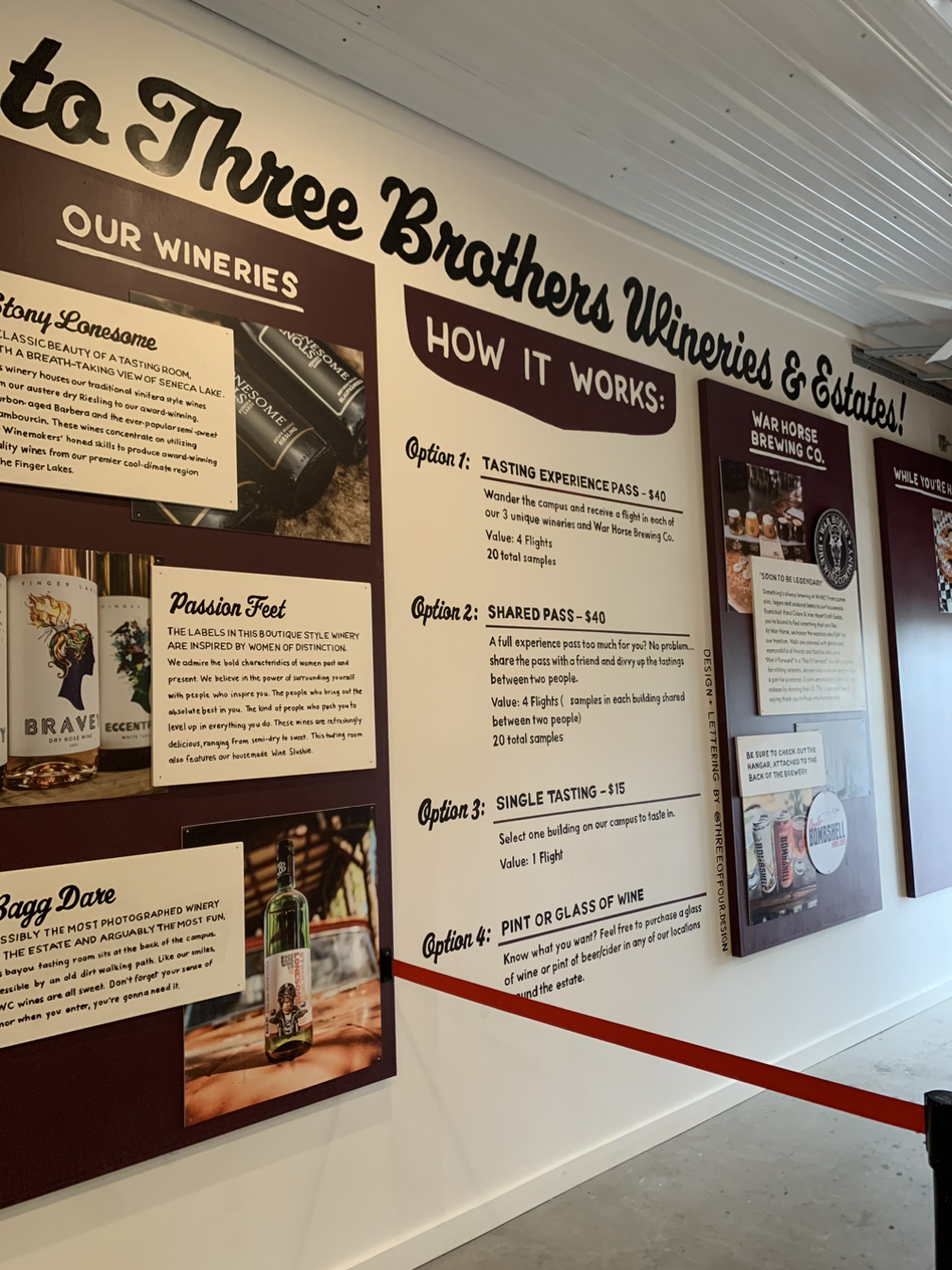 3개의 와이너리는 가장 클래식한 와이너리의 면모를 갖추고 있으며 골드 메달을 수상한 리즐링을 맛볼 수 있는 스토니 론섬 (Stony Lonesome) 와이너리, 부티크 호텔을 테마로 와인 슬러시 등 트렌디한 와인을 맛볼 수 있는 패션 핏 (Passion Feet), 그리고 80~90년대 빈티지한 미국 인테리어로 사진을 안 찍을 수 없게 하는 백 데어 (Bagg Dare)로 이루어져 있다.