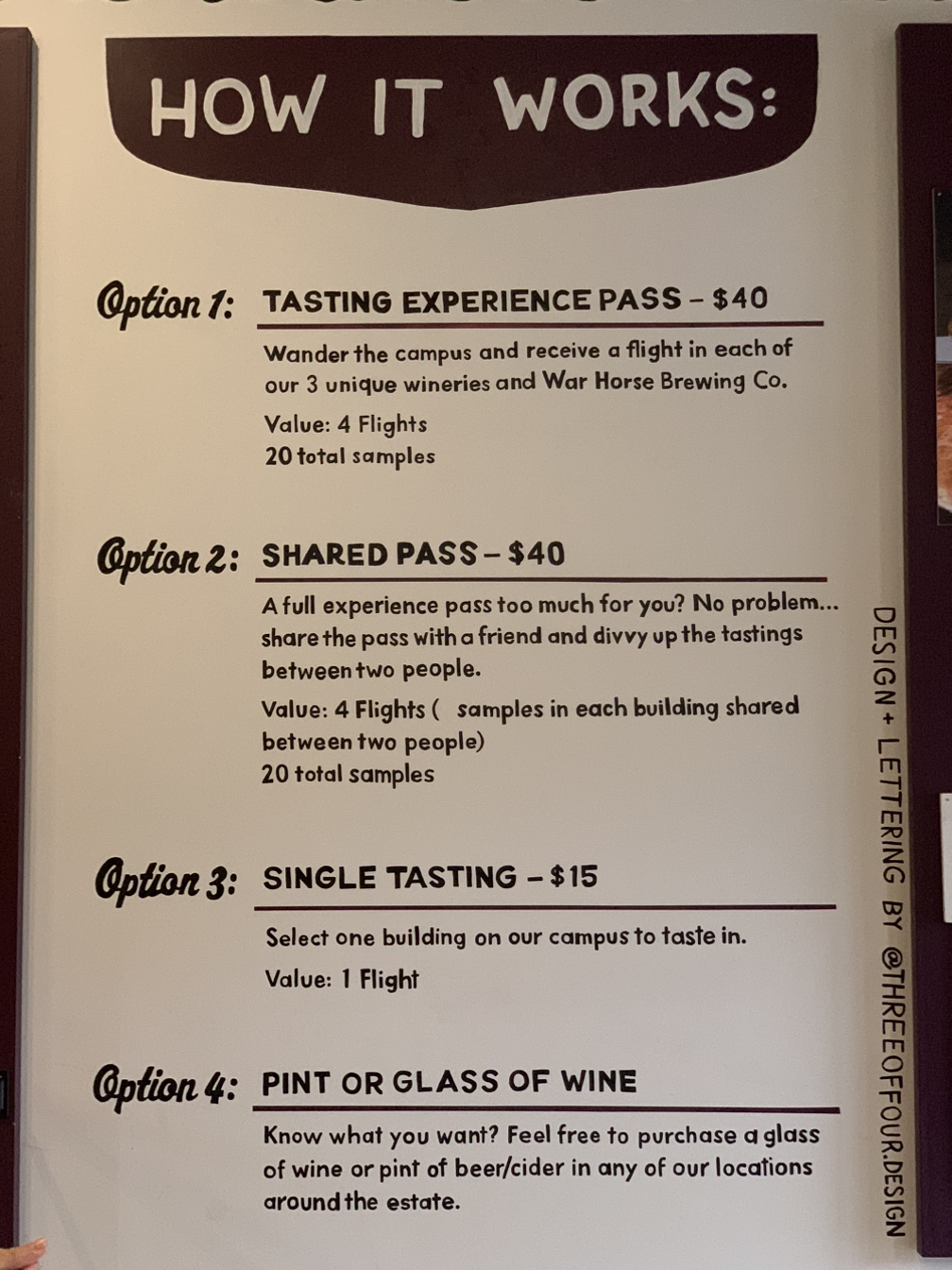 즉, 한 사람당 $20 (2~3만 원)에 약 20개의 다른 와인 및 맥주를 맛볼 수 있는 셈이다. 이 외에도 어린이들을 위한 소다 옵션도 있기 때문에 가족 단위로 여행온 방문객도 쉽게 찾아볼 수 있었다.