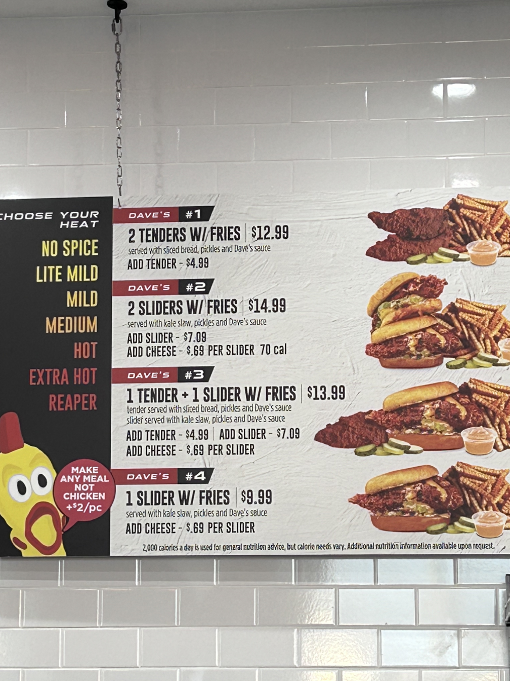 데이브의 핫치킨 메뉴에서 귀여웠던 점은 가장 매운맛을 "super hot"과 같은 표현을 쓰기보다 "Reaper" 즉, 저승사자라는 표현을 썼다는 점이다. 핫도 이렇게 매웠는데 리퍼는 정말 매워 죽을 수도 있겠다는 생각에 고개가 끄덕여지긴 했다.