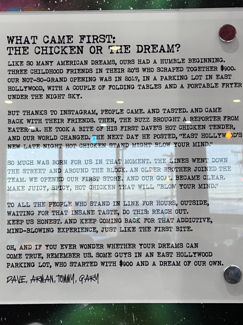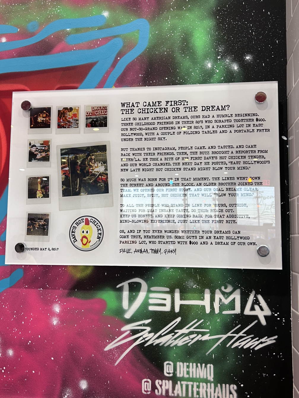 캘리포니아 LA길거리에서 시작한 만큼 스트릿 분위기를 물씬 풍기는 인테리어와 과속스캔들의 카메오로 열연을 펼쳤던 "울부짖는 미친 닭" 로고까지, 칙필레나 파파이스와 다른 데이브만의 그 분위기에 새 뉴욕 지점이 열자마자 뉴욕 주민들이 웨이팅 3시간을 마다하고 비 오는 날에도 줄을 섰다.