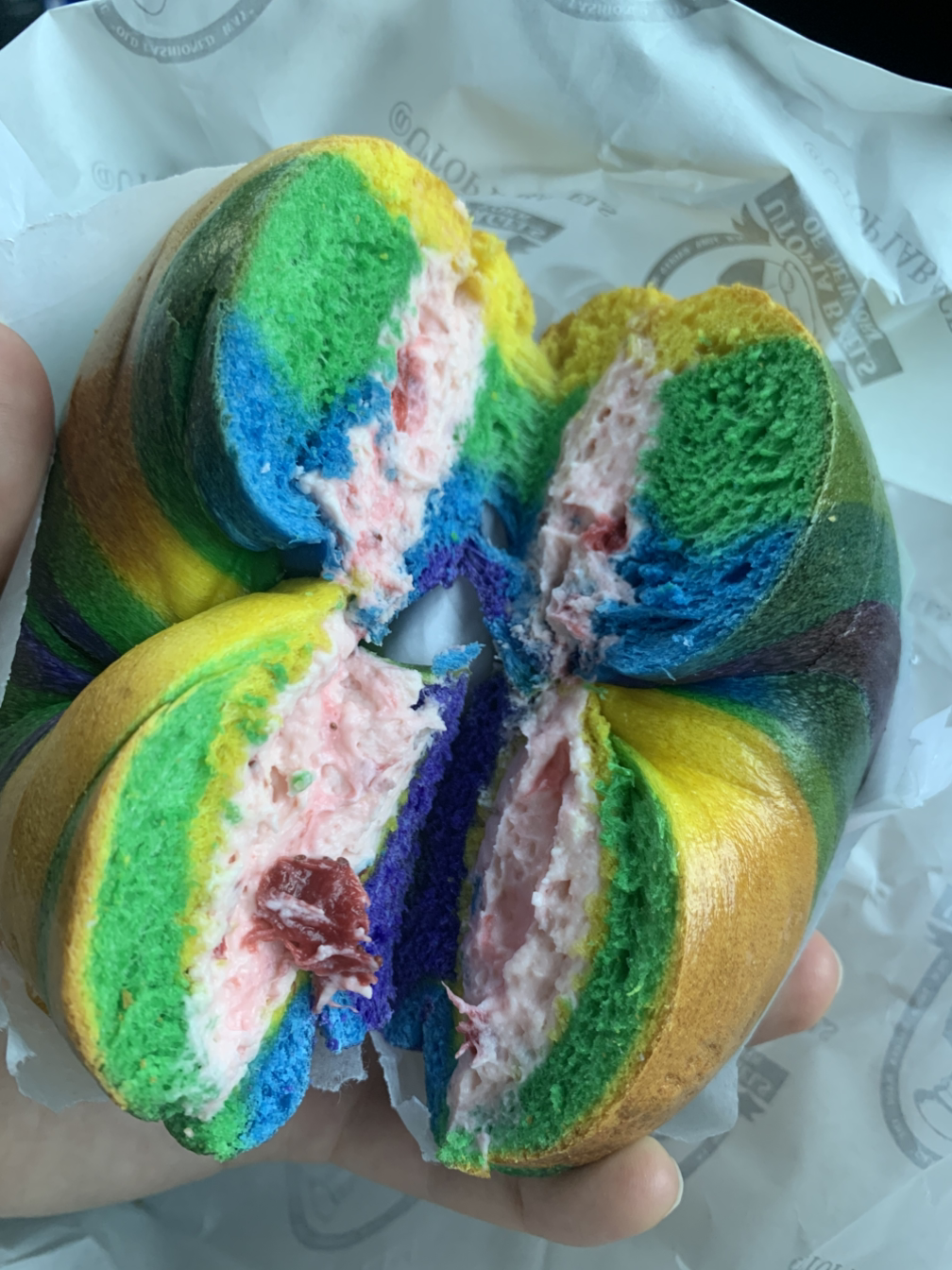 글쓴이는 레인보우 베이글에 딸기 크림치즈를 골랐는데 바삭한 식감 다음, 너무 달지 않고, 딸기의 원물이 느껴지는 크림치즈가 들어와 마지막 한입까지 맛있게 먹을 수 있었다.