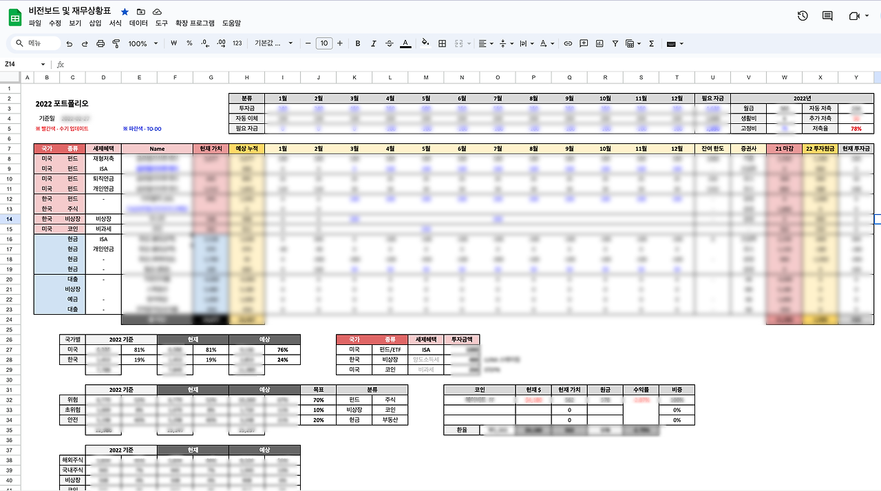 이것저것 맛본다고 굴리는 자산의 종류가 너무 많아졌다. 머리가 핑핑 돌아간다. 그래서 몇 년 전부터 엑셀로 관리하기 시작했다. 매달 얼마를 어디에 넣고, 리밸런싱을 하며 위험자산과 안전자산의 비중을 조절했다. 이래 봬도 P이다.