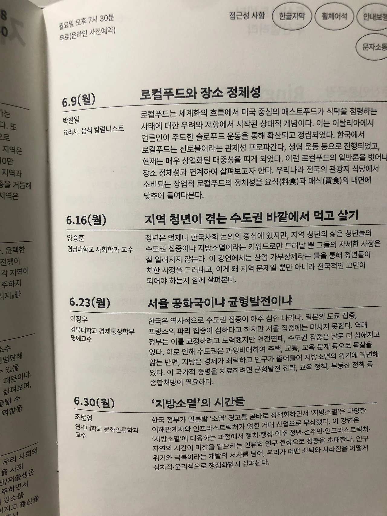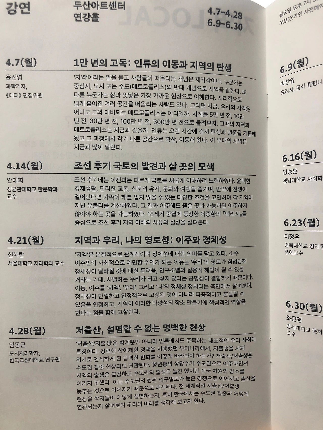 특히 강연은 인류, 이주에서부터 저출산, 균형발전, 지방소멸까지 우리에게 밀접하고 체감되는 이야기들로 구성되어 있습니다. 계속해서 사회적으로 거론되고 있는 이슈들이고, 심화되고 있는 논점들이기에 이번 테마를 통해서 현대사회의 현 위치를 냉철히 꼬집어 볼 수 있을 것 같습니다.