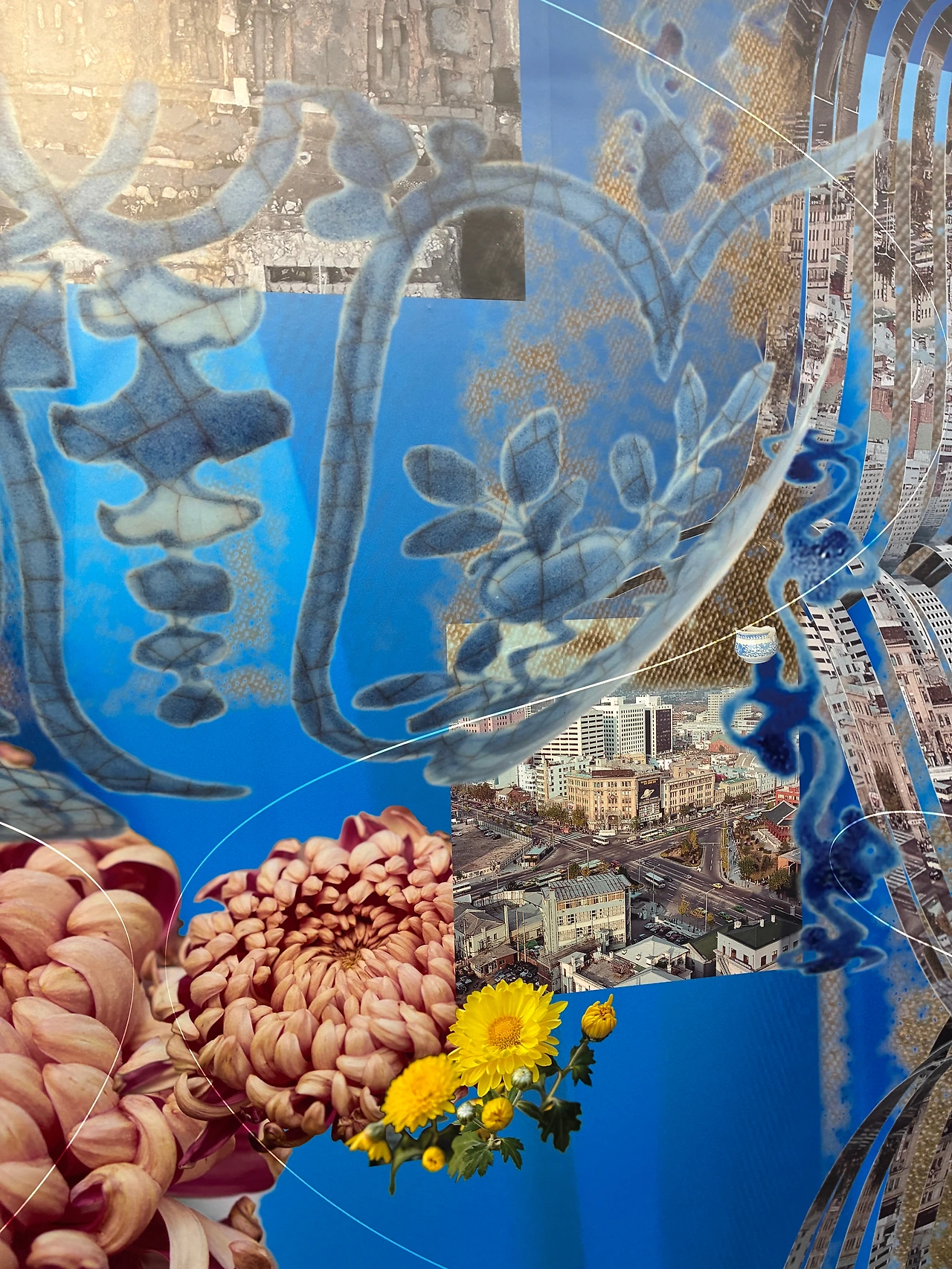 다음은 푸르게 벽면을 가득 메운 김보경 작가의 작품입니다. 멀리서 보면 푸른 인상이 세게 남지만, 가까이서 보면 푸른 배경에 담긴 갖가지 요소들이 제법 흥미롭게 다가옵니다. 조선시대의 청자 문양을 따라 이어지는 꽃과 역사, 그리고 종로로 보이는 사진까지. 마치 종로의 타임라인을 보는 듯합니다. 작가가 가지고 있는 종로에 대한 기억 같기도 합니다. 문양이 길게 늘어선 모습이 해체적인 형태로 보이면서도, 여러 요소들이 문양으로 연결되면서 하나의 총체를 이룹니다. 문양과 사진의 콜라주가 이질감이 들지만, 어색하지 않은 조화를 이루기도 합니다. 개인적으로 이 벽화 앞에 놓인 이유성 작가의 작품으로 종로의 복합성이 두드러져 보였습니다.