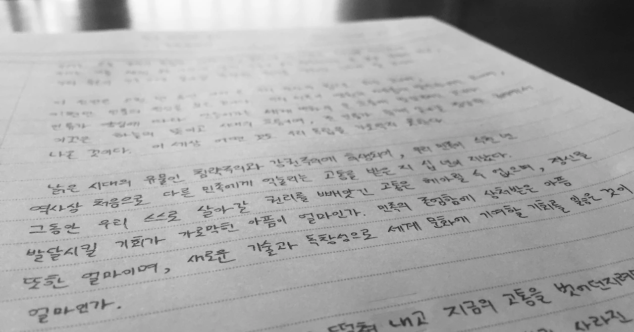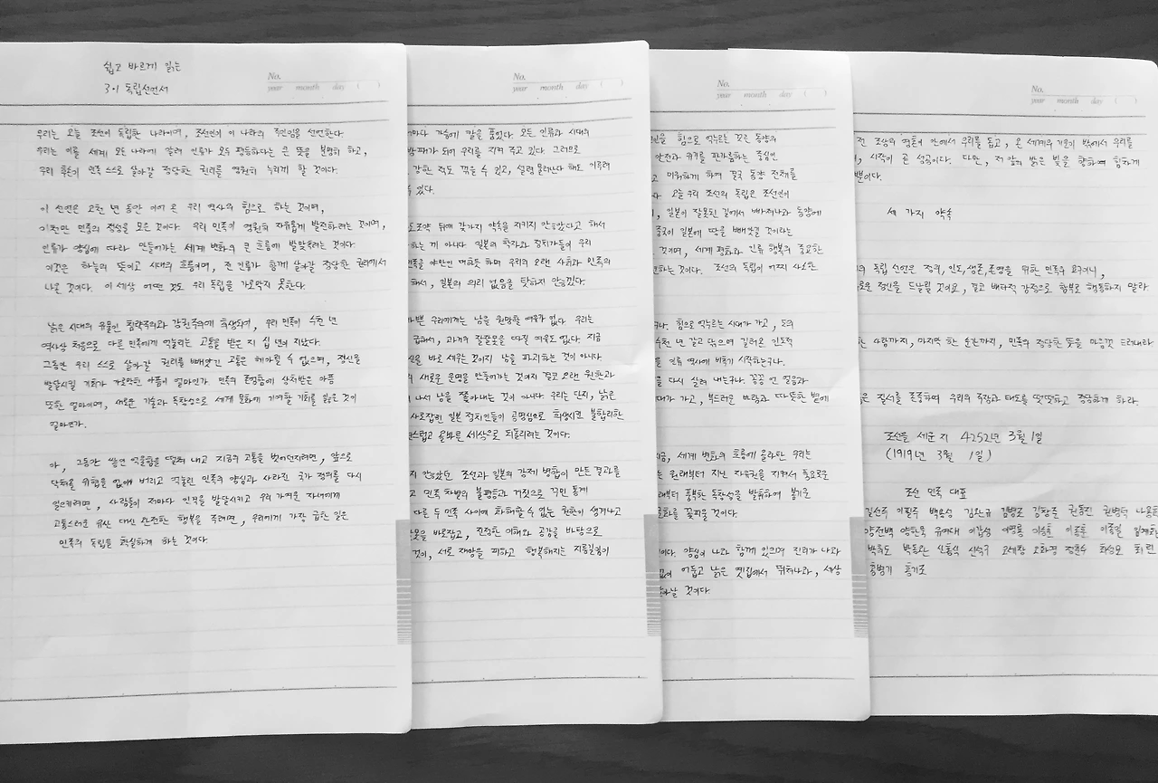 3.1 운동 및 대한민국 임시정부 수립 100주년 기념사업추진위원회는 3.1 운동 100주년을 기념하며 지난 11월에 ‘쉽고 바르게 읽는 3.1 독립선언서’를 펴냈다. 읽기가 조금은 어렵게 느껴질 수 있는 원본을 누구나 부담 없이 읽을 수 있게 하려고 고친 것이다. 지난 3월 1일 3.1절 100주년 기념식에서도 이를 낭독하는 시간이 있었다. 이어 최근에는 ‘독립선언서 필사 챌린지’라고 하는 캠페인 역시 이루어지고 있다. 이처럼 독립선언서를 향한 관심이 어느 때보다 높다. 역사에 관심은 많았지만, 독립선언서 전문을 적어본 적은 없었기에 이번 필사가 문장을 곱씹으며 기억할 수 있는 의미 있는 활동이 될 것 같아서 한 글자 한 글자 정성을 담아 적어보았다.