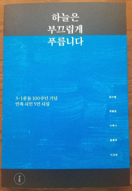 창비에서는 3.1 운동 100주년을 기념해 김소월, 한용운, 이육사, 윤동주, 이상화 시인의 시집을 담은 <하늘은 부끄럽게 푸릅니다>를 출간했다. 당시의 느낌을 살리고자 노력했다고 한다. 다섯 시인은 워낙 유명하기에 한 번쯤 들어본 시가 적지 않다. 그러나 다섯 시인의 시집을 모두 다 읽어본 것은 아니기에 한 번에 읽어볼 좋은 기회라고 생각했다. 각 시인의 시집을 한 권씩 읽는 것과 이렇게 모음 형식의 시집을 읽는 것은 각자마다 장점이 있다고 생각한다. 한 시인의 시를 담은 시집은 온전히 그 시인의 생각과 세계에 깊이 녹아들 수 있다는 점이 장점이 된다고 본다. 그리고 이 책처럼 여러 시인의 시집을 한 권에 담아낸 책은 ‘생각의 연장선’을 놓아준다는 장점이 있는 것 같다. 한 시인에서 다른 시인으로 시집이 이어지면서 시상도 이어지거나, 비슷한 시상도 다르게 보는 등 더 다채로운 관점으로 생각하게 하는 것 같다. 예를 들어 독립에 대한 열망, 봄, 가을 등을 주제로 해도 시인마다 다른 표현의 특징을 눈여겨볼 수도 있고 이러한 다채로운 관점에 물들며 우리의 정서와 생각도 더욱더 풍요로워지는 것 같아서 좋았다. 김소월의 <진달래꽃>, 한용운의 <님의 침묵>, 윤동주의 <서시> 등 대표적이고 익숙한 시들도 반갑게 보았고 김소월의 <여름의 달밤>, 윤동주의 <눈 오는 지도> 등 새롭게 알게 된 좋은 시에도 주목할 수 있는 계기였다. 펜 끝에서 아름다운 표현으로 녹여낸 시들을 읽으며 마음의 양식을 채우고 그들의 꺾을 수 없던 독립 의지를 기억할 수 있는 시간이었다.