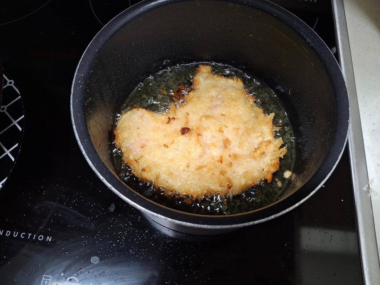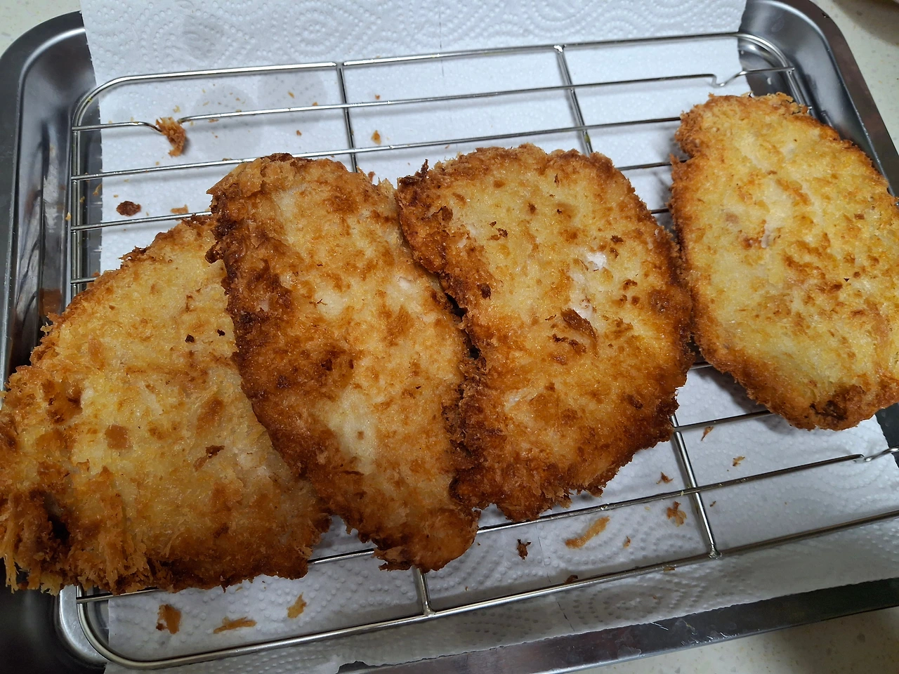 동네 정육점에서 만들어둔 돈까스를 튀겨 만들었는데