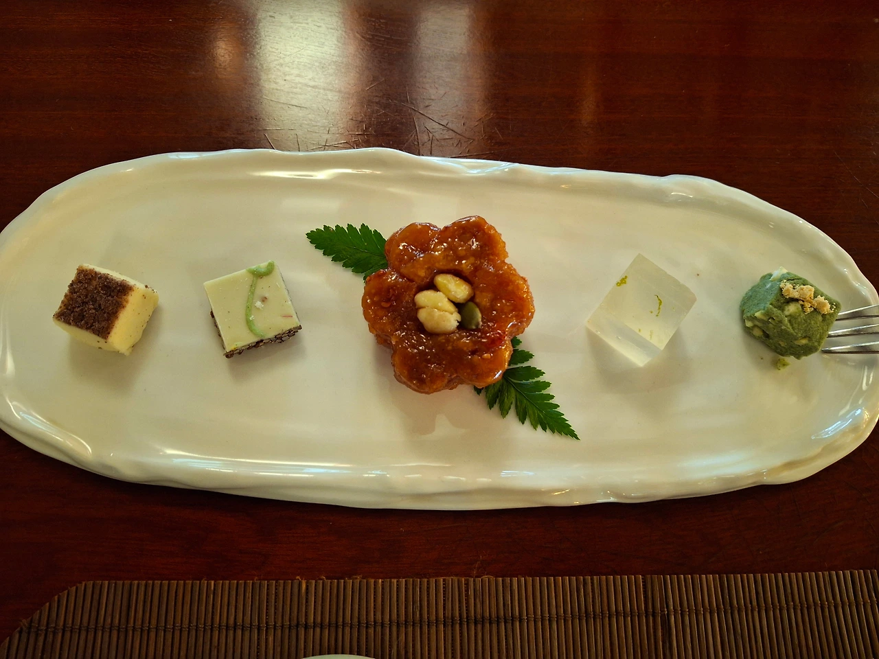 백아차와 곁들여 먹을 다식으로 산딸기 꽃약과와 다과 곁들임(7,800원)도 함께 주문했다. 산딸기 엿에 즙청한 꽃 모양의 개성약과, 유자와 흑임자 반자, 유자코코넛 양갱과 들깨초콜릿 강정까지..
