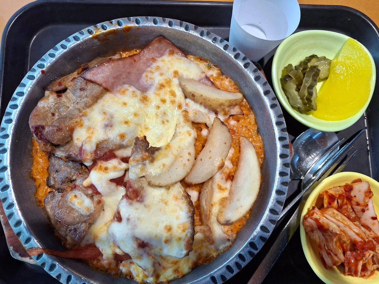 이 날의 메뉴는 닭갈비볶음밥, 짜장떡볶이, 짬뽕라면, 꿔바로우, 콩나물무침, 김치, 샐러드였고 이게 7천원이면 꽤 훌륭하다고 본다!