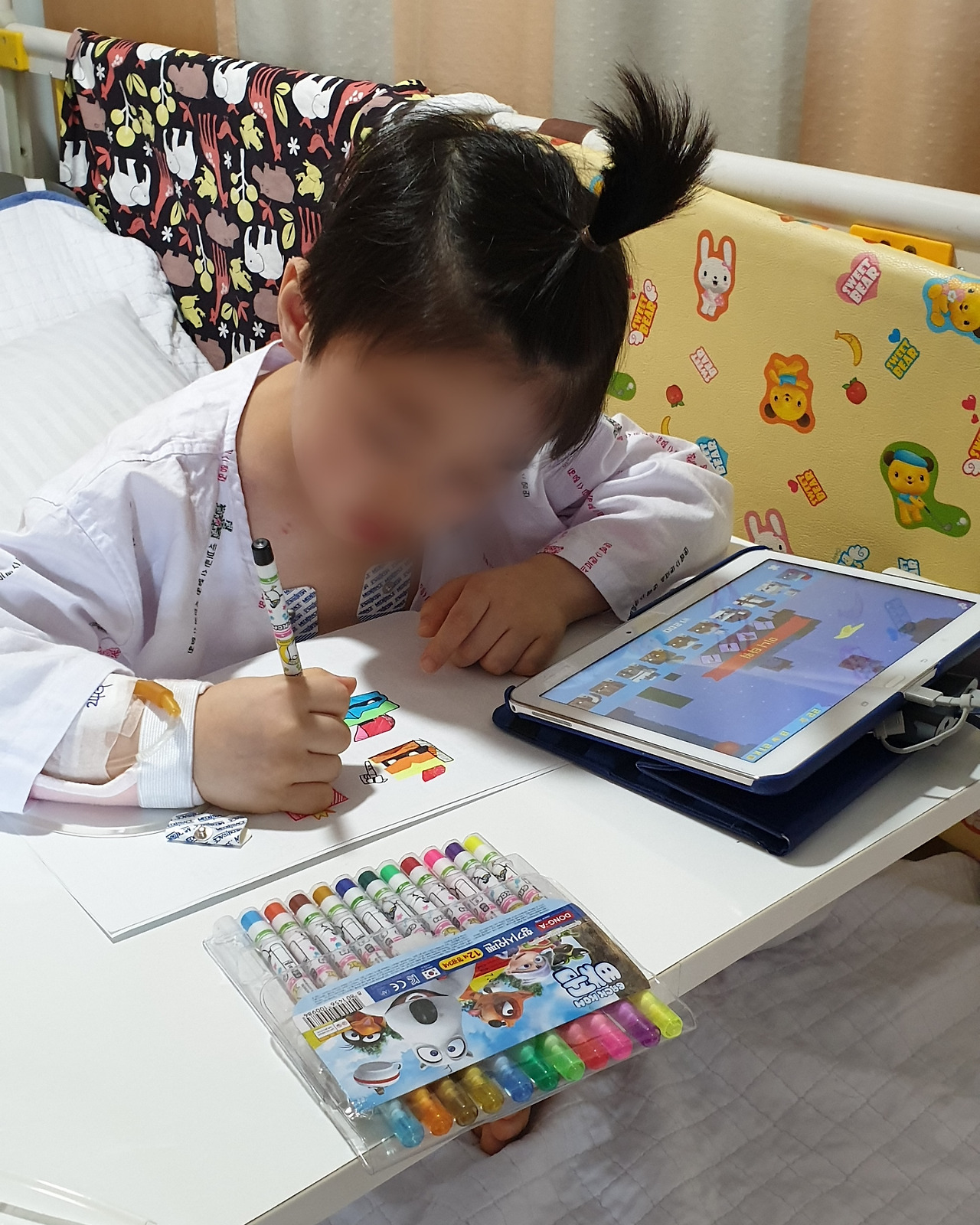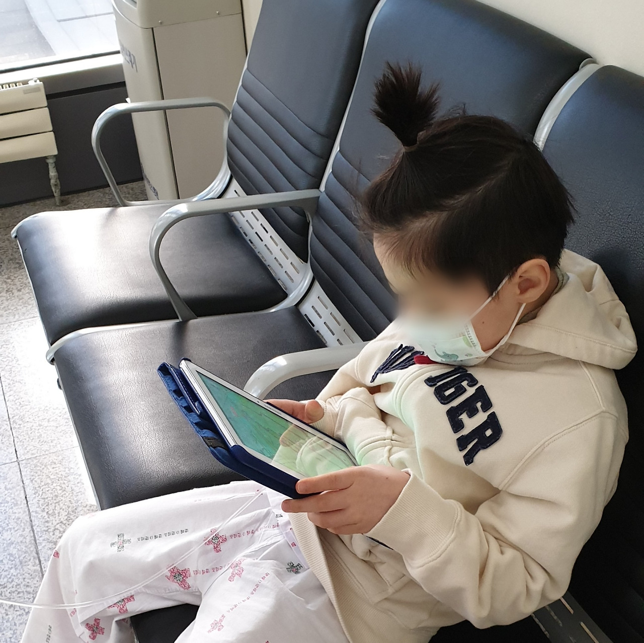 할 게 없는 병원에다가 주사 등으로 아이들 달랠 일이 많았기에 이렇듯 거의 대다수 환아들이 태블릿 끼고 살았다. 아이를 양육하면서 미디어 노출을 자제하려 노력했던 모든 것들이 입원하면서 다ㅋㅋ 날아가버렸지만 그럼에도 미디어를 통해 아픔이라던가 힘듦을 잊는 게 차라리 나았다. 학습용으로 구입했던 태블릿을 유튜브 동영상 시청 및 게임용으로 미친 듯이 돌리며 고통의 시간이 빨리 지나가길 바라고 또 바랬다.