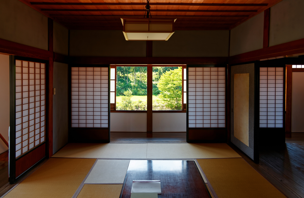 후스마와 쇼지를 열고 닫으면, 다다미 모듈 위에서 방의 경계와 성격이 즉각적으로 바뀐다. 공간은 고정된 ‘실’이라기보다 운영되고 조합되는 시스템이 된다. 벽이 공간을 확정하는 것이 아니라, 미닫이가 매 순간 공간을 편집한다. 이 결합은 입면에도 영향을 준다. 일정한 기둥 간격의 반복, 그 프레임 사이에 끼워지는 쇼지의 연속은 입면을 가로로 ‘눕혀진’ 리듬으로 만든다. 일본 집의 창은 “벽에 뚫린 구멍”이라기보다, 프레임 안에서 얇은 막(스크린)이 연속되는 인상이 강하다. 벽이 단단히 닫혀 있다가 창만 열리는 것이 아니라, 면 자체가 미닫이로 바뀌며 열리고 닫힌다.
