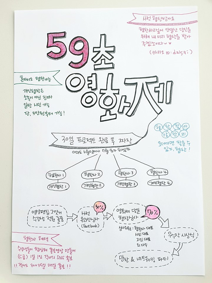 슬슬 포스터 준비가 완료되고 집행위원이 구성되면 본격적으로 기업 대상 협찬을 요청드리려고 합니다. 현재는 한정혜 본인의 컨디션 관리 실패로 인해 '구순포진'에 걸려 있는 병중이므로 <59초 영화제>에 대한 간략한 브리핑만 하도록 하겠습니다.
