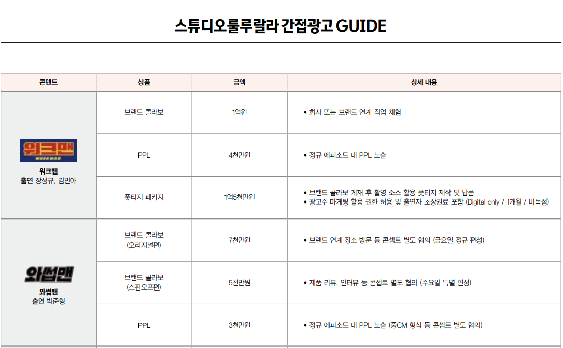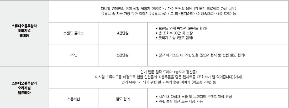 위는 JTBC 스튜디오 룰룰랄랄 광고 단가표다. 특별하게 구한 건 아니고 전부 사이트에 오픈된 내용이다. 위 두 프로그램은 JTBC에서 성공적으로 안착한 프로그램에 광고 단가인 것. 그리고 아래는 반대로 아직 성공하지 못한 상태의 실험 중인 콘텐츠에 한한 광고 단가표다. 두 배 정도 규모 차이가 난다.