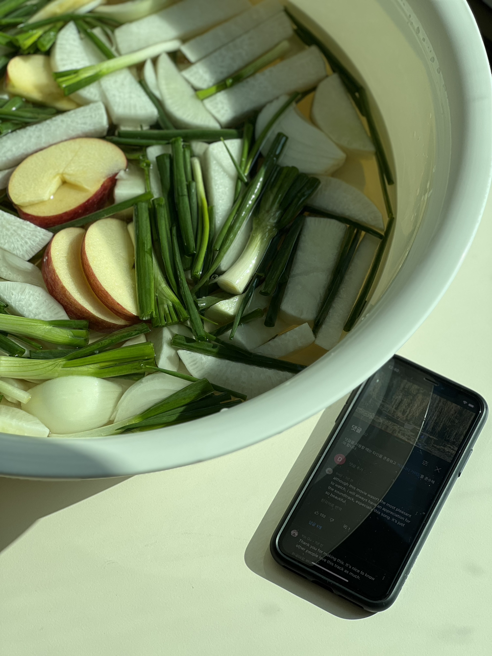 생강 한 톨을 다지기 시작했고, 쪽파를 손가락만큼의 길이로 가지런히 모아 썰었다. 마늘은 편으로 썰고 고추는 꼭지만 떼어 다듬었다. 소금과 설탕의 양을 계량하고 매실청은 손 가는 대로 휘휘 부었다. 난생처음 만들어 보는 동치미였다. 늦가을을 맞이한 무가 그 역량을 다 해줄 것을 믿으며 얼기설기 엉성한 레시피를 따랐다. 칼질을 하다 적막한 실내를 채우고자 엔리오 모리꼬네를 틀었다. 모차르트를 들으며 발효된다는 된장들처럼 너희들도 모리꼬네 선생님과 함께 소금물 아래서 편안한 시간 보내렴. 마지막 국물을 붓고 락앤락 뚜껑을 닫았다. 이제 남은 것은 기다림이다.