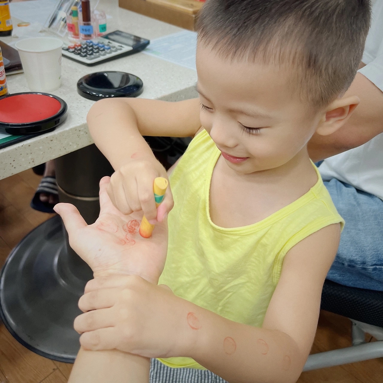 부동산으로 향하는 우리의 발걸음은 가볍다. 예산에 맞는 집을 구하려 할 때나, 어디 한번 집을 내어볼까 고심하며 문 두드릴 때와는 다르다. 오늘은 계약날, 약속 시간보다 조금 일찍 들어섰다. 매수자와 상대 부동산 사장님은 조금 늦는 모양이다. 살짝 지루해진 꼬마가 몸을 배배 꼬길래 짧은 산책도 다녀온다. 어딜 가나 지각자는 질색이지만, 날이 날이니만큼 나의 음성은 나긋나긋하다. 드디어 계약성 작성의 시간. 무릎에 앉혀놓은 꼬마는 눈앞의 도장이 탐나는 모양이다. 사장님이 계약서 항목을 읊고, 둘러앉은 모두 이를 경청하는데 꼬마는 도장을 찍어보고 싶다고 조른다. 그래, 하고 내 도장을 쥐어주니 덥썩 내 손등에 도장을 찍는다. 이름 석자가 또렷하게 새겨진다. 이윽고 도장은 손등과 손바닥을 지나 팔뚝까지 상륙한다.